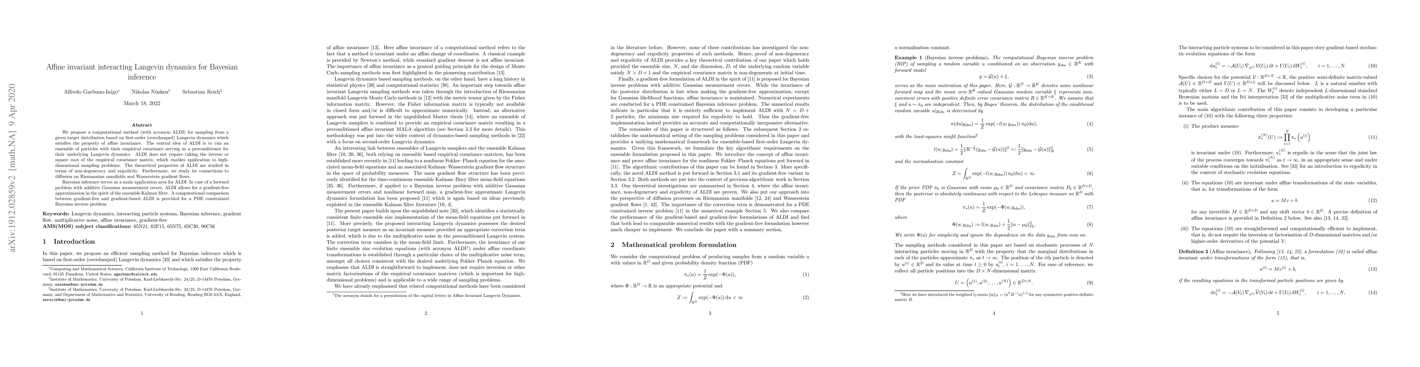 This paper introduces ALDI, a novel affine invariant sampling method based on Langevin dynamics, which leverages an ensemble of particles and their empirical covariance for preconditioning, enabling efficient high-dimensional sampling. The method is applied to Bayesian inference, offering a gradient-free alternative for PDE constrained inverse problems.