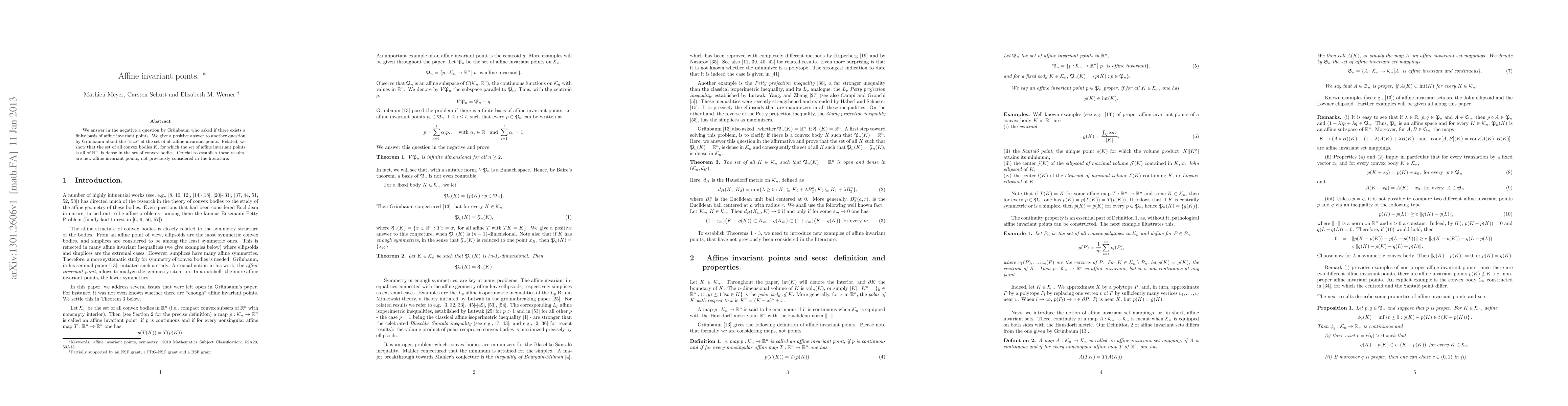 The paper negatively answers Gruenbaum's question on a finite basis of affine invariant points, and positively addresses another question about the 'size' of all affine invariant points. It introduces new, unprecedented affine invariant points, demonstrating that the set of convex bodies with affine invariant points filling n-dimensional space is dense in all convex bodies.