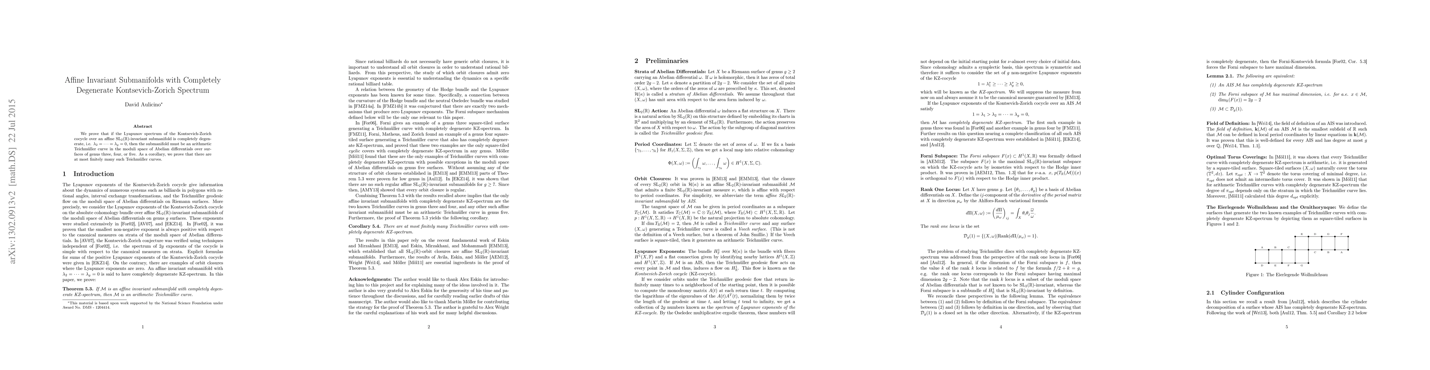 We prove that if the Lyapunov spectrum of the Kontsevich-Zorich cocycle over an affine SL$(2,\mathbb{R})$-invariant submanifold is completely degenerate, i.e. $\lambda_2 = \cdots = \lambda_g = 0$, then the submanifold must be an arithmetic Teichmueller curve in the moduli space of Abelian differentials over surfaces of genus three, four, or five. As a corollary, we prove that there are at most finitely many such Teichmueller curves.