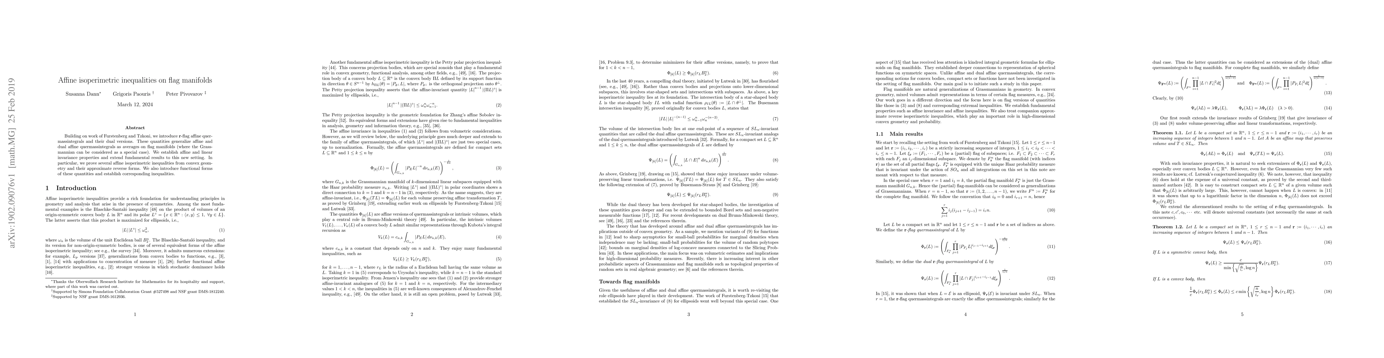 Building on work of Furstenberg and Tzkoni, we introduce ${\bf r}$-flag affine quermassintegrals and their dual versions. These quantities generalize affine and dual affine quermassintegrals as averages on flag manifolds (where the Grassmannian can be considered as a special case). We establish affine and linear invariance properties and extend fundamental results to this new setting. In particular, we prove several affine isoperimetric inequalities from convex geometry and their approximate reverse forms. We also introduce functional forms of these quantities and establish corresponding inequalities.