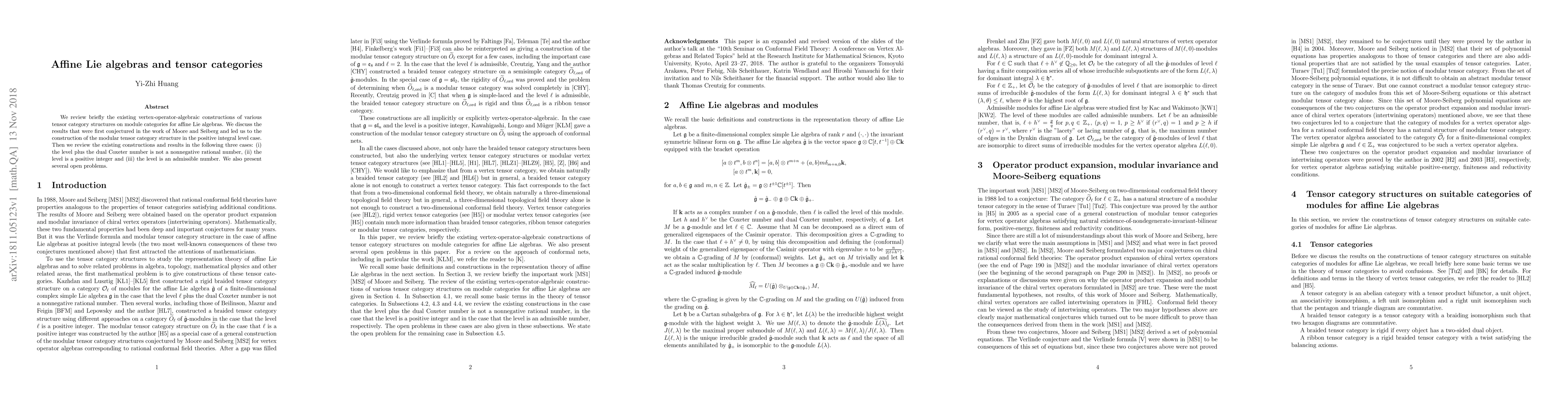This paper reviews tensor category structures on module categories for affine Lie algebras, focusing on constructions and results associated with modular tensor categories, and discusses various levels of the Lie algebra including non-positive rational numbers, positive integers, and admissible numbers. It also highlights several open problems in the field.