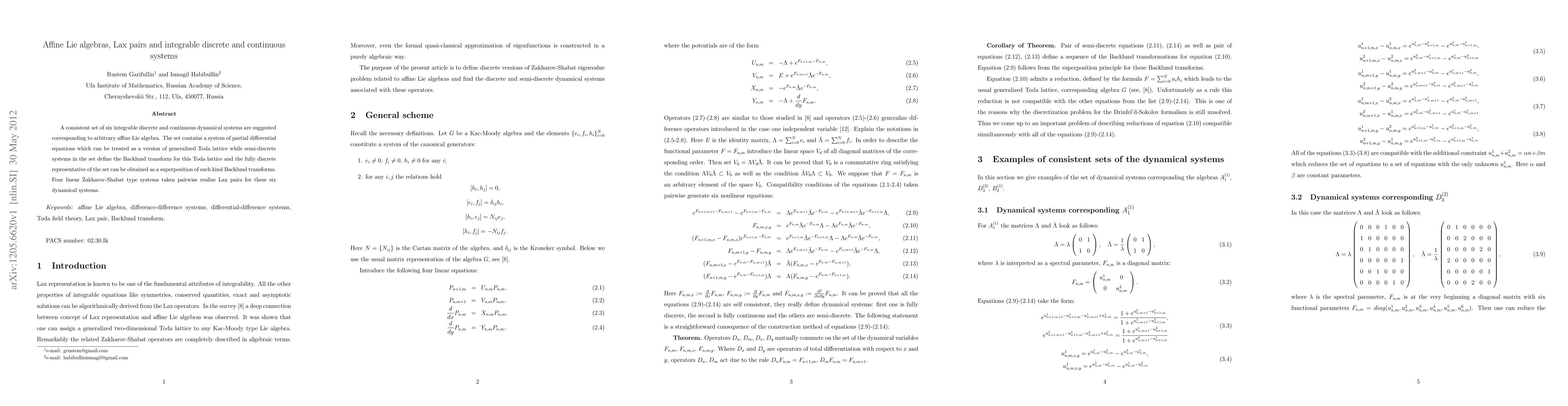 Summary: The paper proposes a set of six integrable dynamical systems, corresponding to arbitrary affine Lie algebras, including continuous PDEs, semi-discrete systems, and fully discrete systems. The systems are linked through Lax pairs and Backlund transforms, with the continuous systems resembling a generalized Toda lattice.