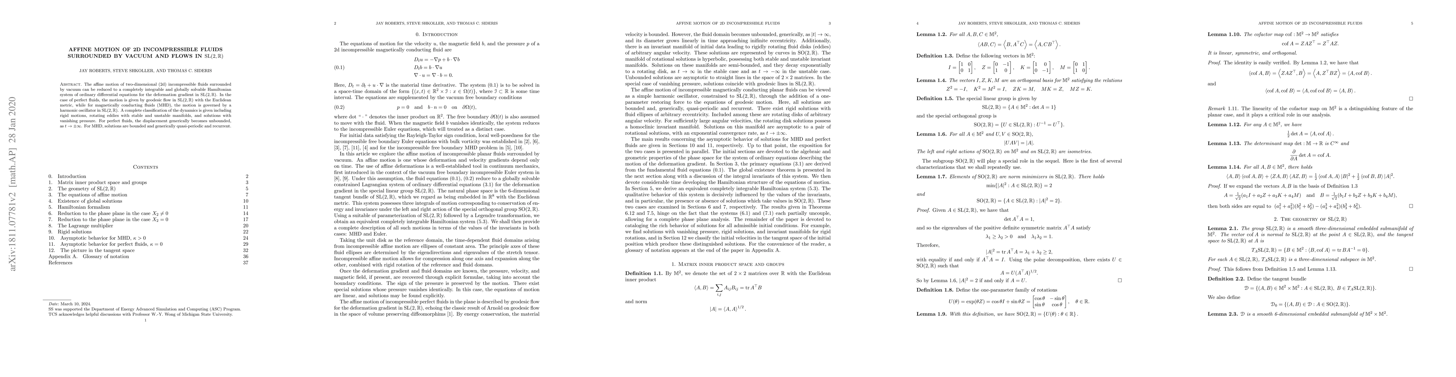 This paper studies the affine motion of two-dimensional incompressible fluids in a vacuum, showing it leads to a globally solvable Hamiltonian system in ${\rm SL}(2,{\mathbb R})$. Perfect fluids exhibit unbounded geodesic flow, while magnetically conducting fluids (MHD) follow a bounded harmonic oscillator, with quasi-periodic and recurrent solutions.