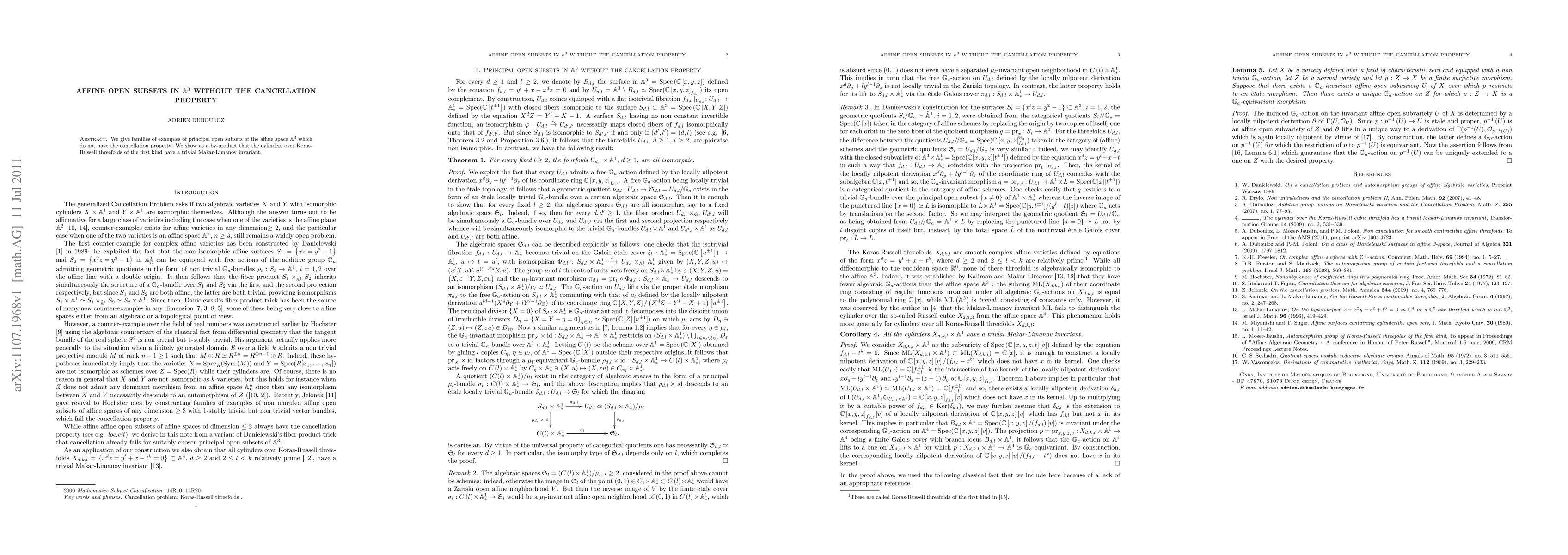 We give families of examples of principal open subsets of the affine space \mathbb{A}^{3} which do not have the cancellation property. We show as a by-product that the cylinders over Koras-Russell threefolds of the first kind have a trivial Makar-Limanov invariant.