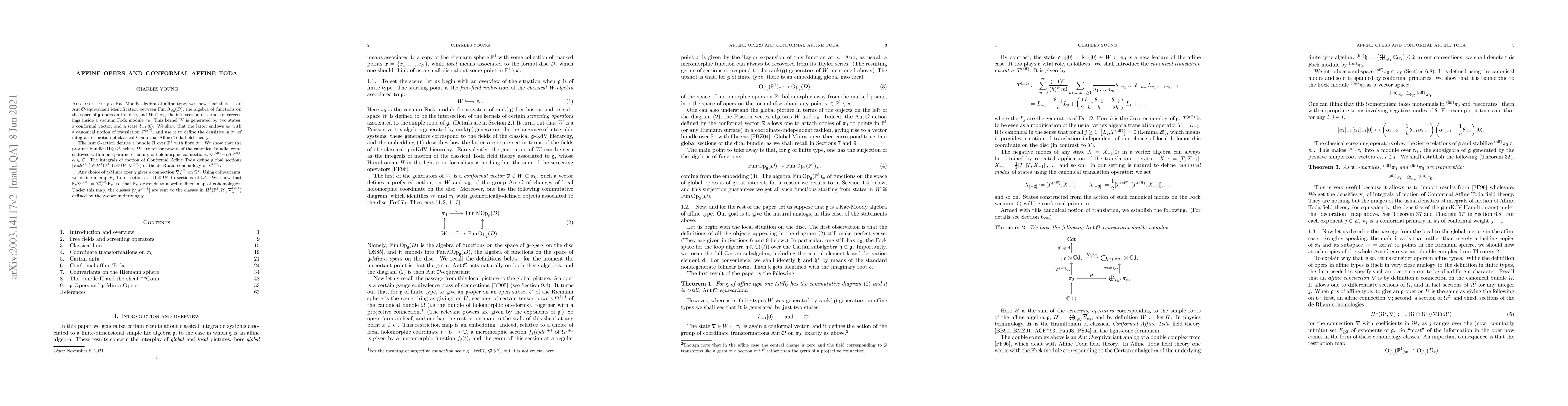 For $\mathfrak g$ a Kac-Moody algebra of affine type, we show that there is an $\text{Aut}\, \mathcal O$-equivariant identification between $\text{Fun}\,\text{Op}_{\mathfrak g}(D)$, the algebra of functions on the space of ${\mathfrak g}$-opers on the disc, and $W\subset \pi_0$, the intersection of kernels of screenings inside a vacuum Fock module $\pi_0$. This kernel $W$ is generated by two states: a conformal vector, and a state $\delta_{-1}\left|0\right>$. We show that the latter endows $\pi_0$ with a canonical notion of translation $T^{\text{(aff)}}$, and use it to define the densities in $\pi_0$ of integrals of motion of classical Conformal Affine Toda field theory. The $\text{Aut}\,\mathcal O$-action defines a bundle $\Pi$ over $\mathbb P^1$ with fibre $\pi_0$. We show that the product bundles $\Pi \otimes \Omega^j$, where $\Omega^j$ are tensor powers of the canonical bundle, come endowed with a one-parameter family of holomorphic connections, $\nabla^{\text{(aff)}} - \alpha T^{\text{(aff)}}$, $\alpha\in \mathbb C$. The integrals of motion of Conformal Affine Toda define global sections $[\mathbf v_j dt^{j+1} ] \in H^1(\mathbb P^1, \Pi\otimes \Omega^j,\nabla^{\text{(aff)}})$ of the de Rham cohomology of $\nabla^{\mathrm{(aff)}}$. Any choice of ${\mathfrak g}$-Miura oper $\chi$ gives a connection $\nabla^{\mathrm{(aff)}}_\chi$ on $\Omega^j$. Using coinvariants, we define a map $\mathsf F_\chi$ from sections of $\Pi \otimes \Omega^j$ to sections of $\Omega^j$. We show that $\mathsf F_\chi \nabla^{\text{(aff)}} = \nabla^{\text{(aff)}}_\chi \mathsf F_\chi$, so that $\mathsf F_\chi$ descends to a well-defined map of cohomologies. Under this map, the classes $[\mathbf v_j dt^{j+1} ]$ are sent to the classes in $H^1(\mathbb P^1, \Omega^j,\nabla^{\text{(aff)}}_\chi)$ defined by the ${\mathfrak g}$-oper underlying $\chi$.
