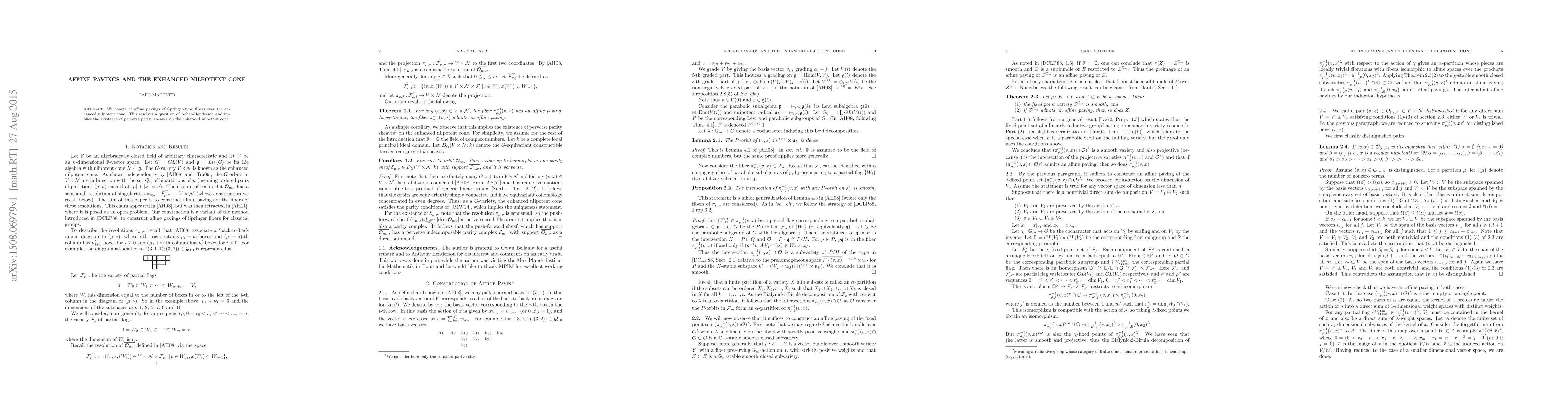 Summary: The paper constructs affine pavings of Springer-type fibers over the enhanced nilpotent cone, resolving a question posed by Achar-Henderson and demonstrating the existence of perverse parity sheaves on this cone.