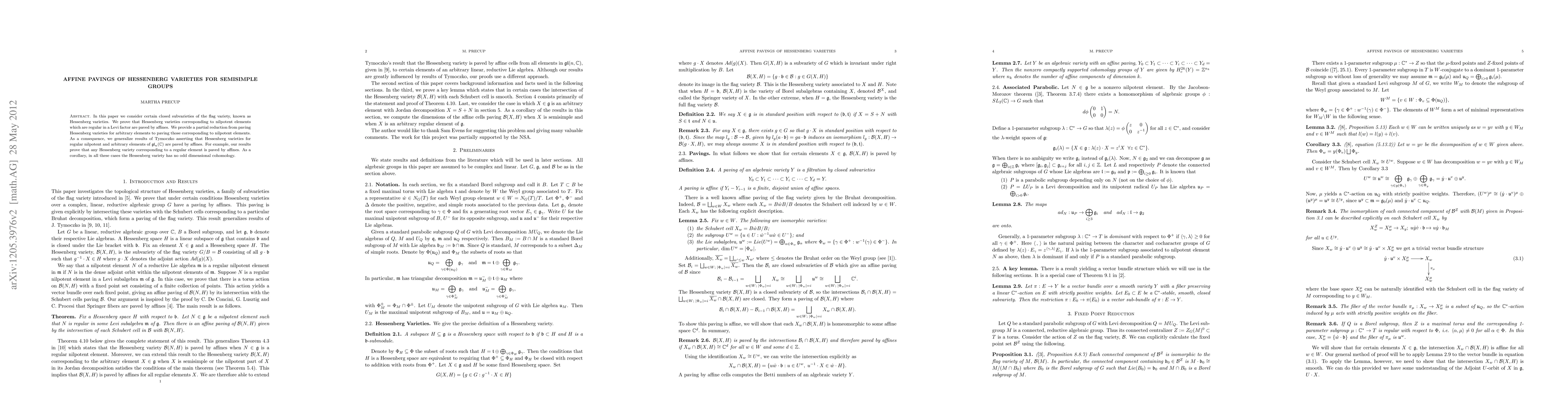 This paper proves that Hessenberg varieties associated with regular nilpotent elements in a Levi factor of semisimple groups are paved by affine spaces. It also provides a reduction method for proving the affine paving of Hessenberg varieties for arbitrary elements, leading to a generalization of Tymoczko's results and confirming that such varieties have no odd-dimensional cohomology.