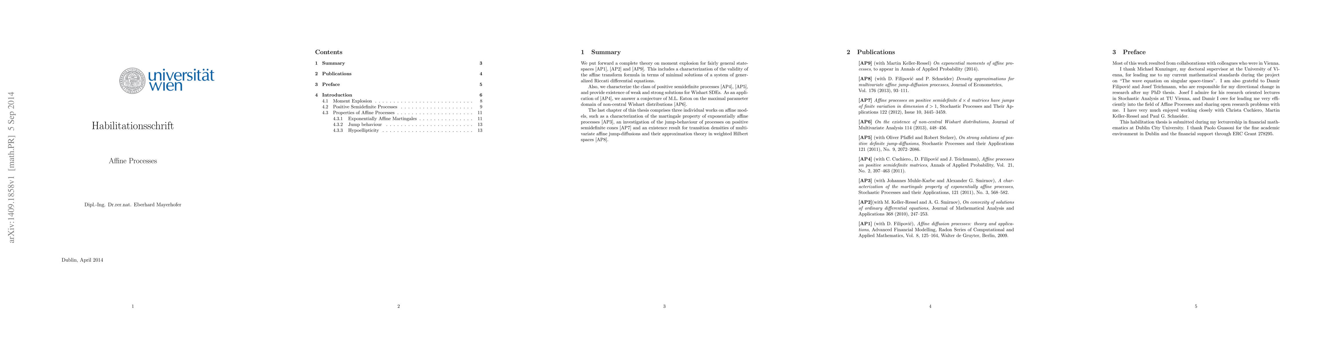 This paper develops a comprehensive theory on moment explosion for affine processes, characterizing the affine transform formula via generalized Riccati differential equations. It also explores positive semidefinite processes, existence of solutions for Wishart stochastic differential equations, and resolves a conjecture regarding non-central Wishart distributions. Additionally, it includes studies on martingale properties, jump behavior, and transition densities of affine models.