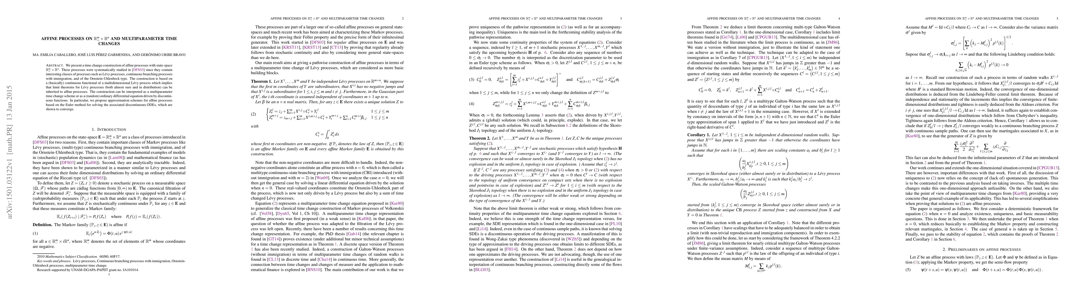 We present a time change construction of affine processes with state-space $\mathbb{R}_+^m\times \mathbb{R}^n$. These processes were systematically studied in (Duffie, Filipovi\'c and Schachermayer, 2003) since they contain interesting classes of processes such as L\'evy processes, continuous branching processes with immigration, and of the Ornstein-Uhlenbeck type. The construction is based on a (basically) continuous functional of a multidimensional L\'evy process which implies that limit theorems for L\'evy processes (both almost sure and in distribution) can be inherited to affine processes. The construction can be interpreted as a multiparameter time change scheme or as a (random) ordinary differential equation driven by discontinuous functions. In particular, we propose approximation schemes for affine processes based on the Euler method for solving the associated discontinuous ODEs, which are shown to converge.