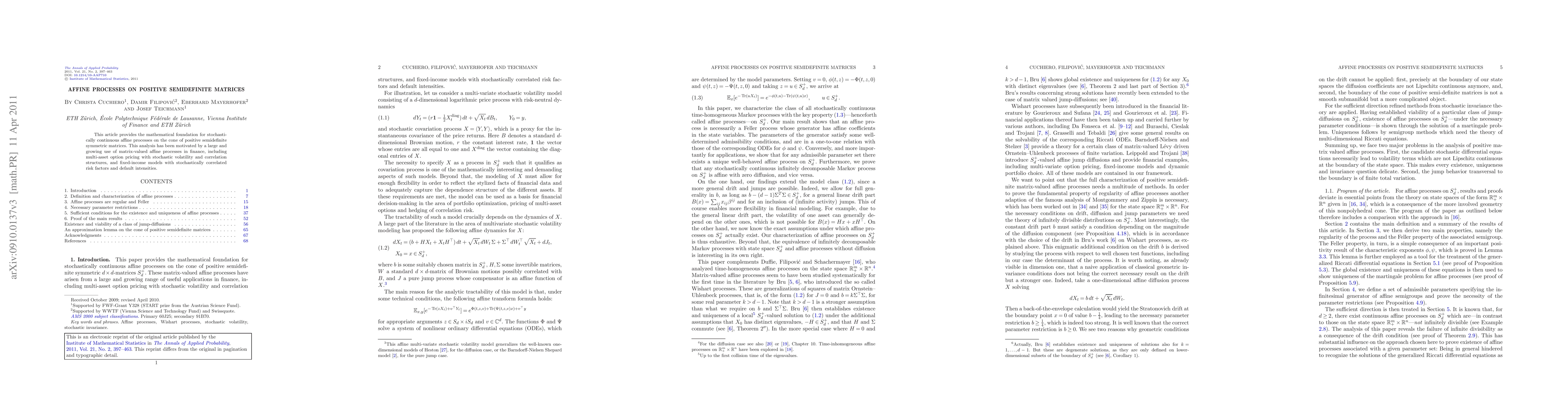 Summary: This paper lays the mathematical groundwork for affine processes on positive semidefinite matrices, crucial for applications in finance such as multi-asset option pricing and fixed-income models with stochastic risk factors. The focus is on stochastically continuous processes on the cone of positive semidefinite symmetric matrices.