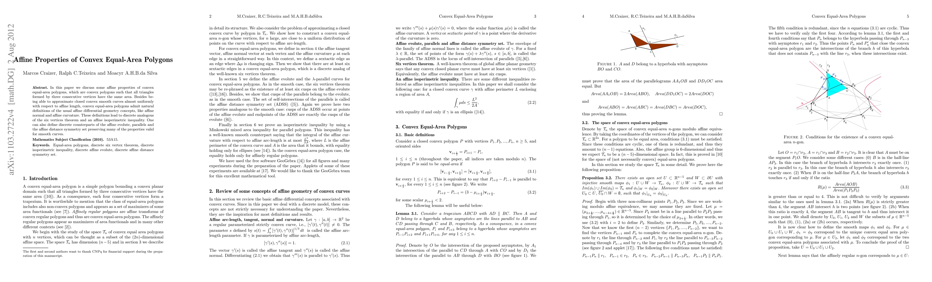 This paper investigates affine properties of convex equal-area polygons, showing their ability to uniformly approximate smooth curves and defining discrete versions of affine differential geometry concepts, leading to theorems and inequalities analogous to those in smooth geometry.