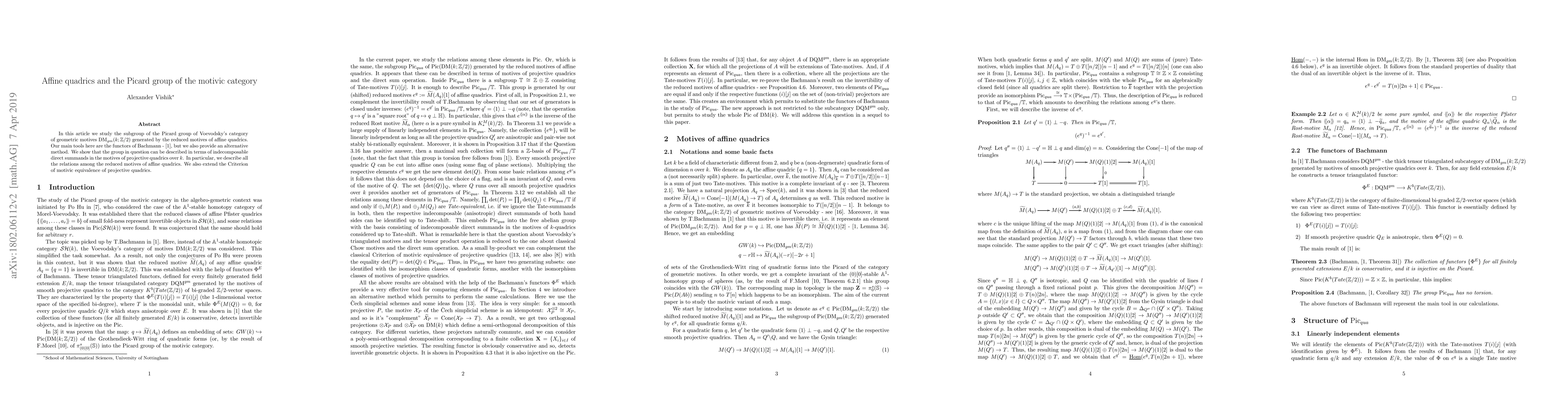 This paper investigates the subgroup of the Picard group in Voevodsky's category of geometric motives generated by affine quadrics, using Bachmann functors and an alternative method. It describes the relations among these motives and extends the Criterion of motivic equivalence for projective quadrics.
