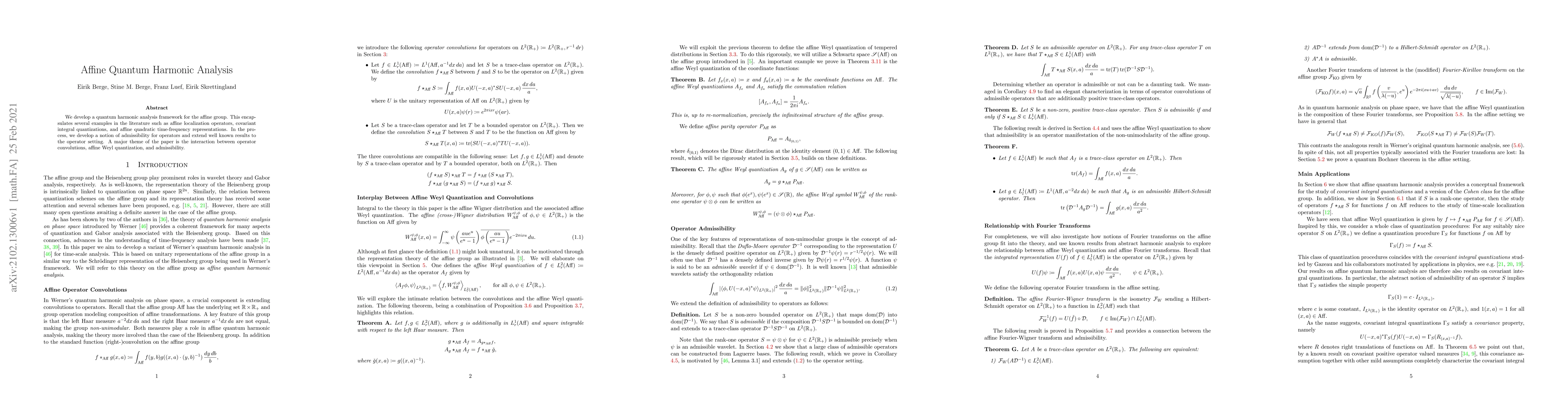This paper introduces a quantum harmonic analysis framework for the affine group, encompassing various examples like affine localization operators and affine quadratic time-frequency representations. It develops a notion of admissibility for operators and explores the interplay between operator convolutions, affine Weyl quantization, and admissibility.