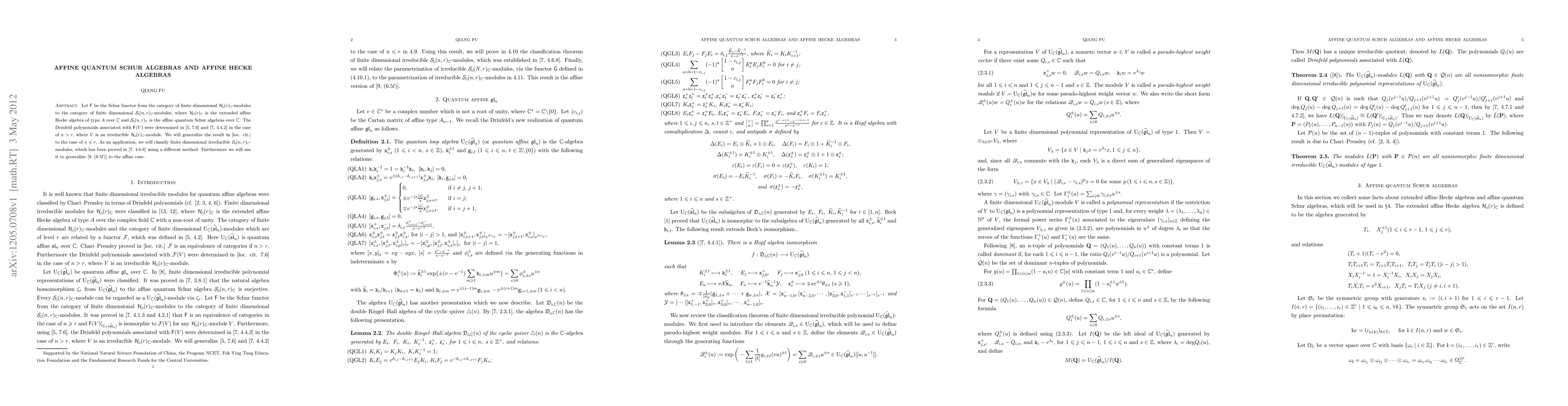 Let ${\mathsf F}$ be the Schur functor from the category of finite dimensional ${\mathcal H}_{\vartriangle}(r)_\mathbb C$-modules to the category of finite dimensional ${\mathcal S}_{\vartriangle}(n,r)_{\mathbb{C}}$-modules, where ${\mathcal H}_{\vartriangle}(r)_\mathbb C$ is the extended affine Hecke algebra of type $A$ over ${\mathbb C}$ and ${\mathcal S}_{\vartriangle}(n,r)_{\mathbb{C}}$ is the affine quantum Schur algebras over $\mathbb{C}$. The Drinfeld polynomials associated with ${\mathsf F}(V)$ were determined in \cite[7.6]{CP96} and \cite[4.4.2]{DDF} in the case of $n>r$, where $V$ is an irreducible ${\mathcal H}_{{\vartriangle}}(r)_\mathbb C$-module. We will generalize the result in [loc. cit.] to the case of $n\leq r$. As an application, we will classify finite dimensional irreducible ${\mathcal S}_{\vartriangle}(n,r)_{\mathbb{C}}$-modules, which has been proved in \cite[4.6.8]{DDF} using a different method. Furthermore we will use it to generalize \cite[(6.5f)]{Gr80} to the affine case.