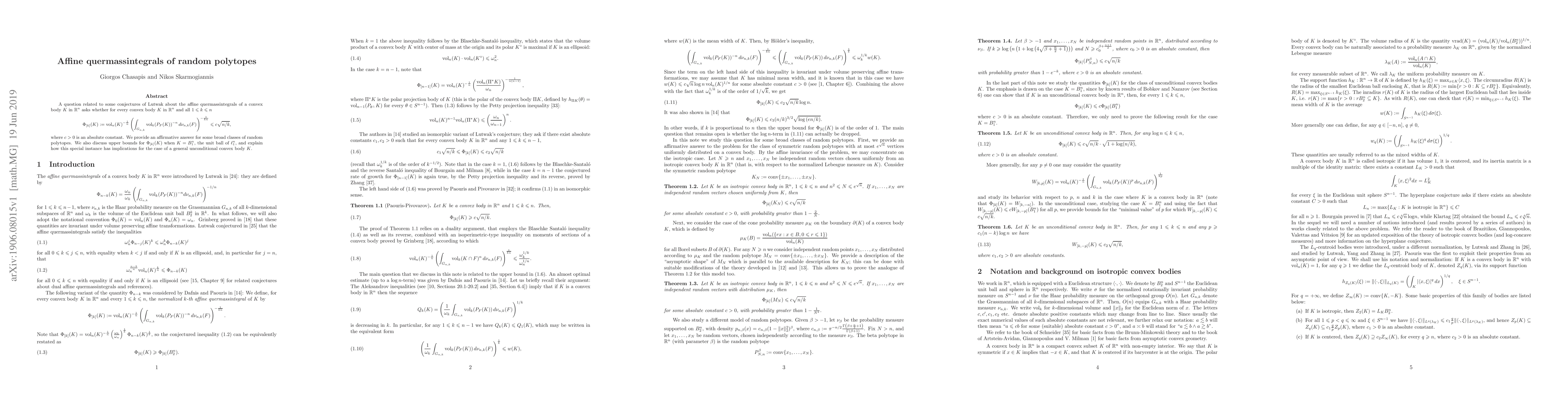 A question related to some conjectures of Lutwak about the affine quermassintegrals of a convex body $K$ in ${\mathbb R}^n$ asks whether for every convex body $K$ in ${\mathbb R}^n$ and all $1\leqslant k\leqslant n$ $$\Phi_{[k]}(K):={\rm vol}_n(K)^{-\frac{1}{n}}\left (\int_{G_{n,k}}{\rm vol}_k(P_F(K))^{-n}\,d\nu_{n,k}(F)\right )^{-\frac{1}{kn}}\leqslant c\sqrt{n/k},$$ where $c>0$ is an absolute constant. We provide an affirmative answer for some broad classes of random polytopes. We also discuss upper bounds for $\Phi_{[k]}(K)$ when $K=B_1^n$, the unit ball of $\ell_1^n$, and explain how this special instance has implications for the case of a general unconditional convex body $K$.