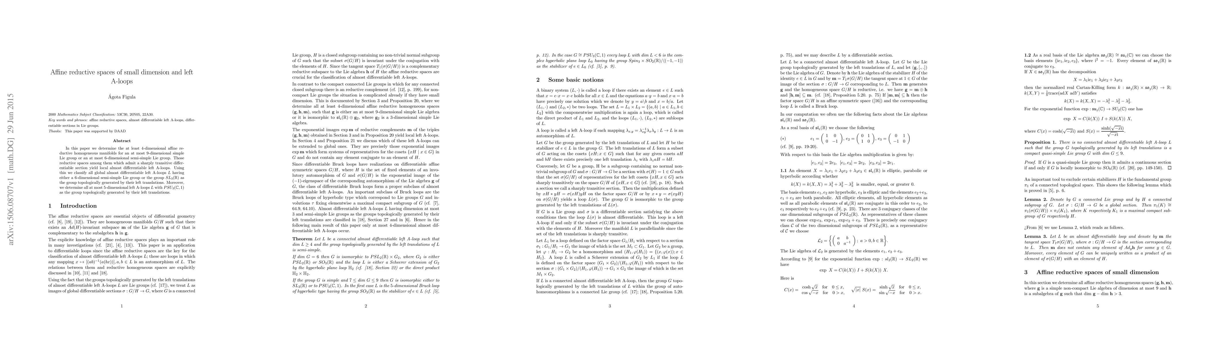 In this paper we determine the at least $4$-dimensional affine reductive homogeneous manifolds for an at most $9$-dimensional simple Lie group or an at most $6$-dimensional semi-simple Lie group. Those reductive spaces among them which admit a sharply transitive differentiable section yield local almost differentiable left A-loops. Using this we classify all global almost differentiable left A-loops $L$ having either a $6$-dimensional semi-simple Lie group or the group $SL_3(\mathbb R)$ as the group topologically generated by their left translations. Moreover, we determine all at most $5$-dimensional left A-loops $L$ with $PSU_3(\mathbb C,1)$ as the group topologically generated by their left translations.