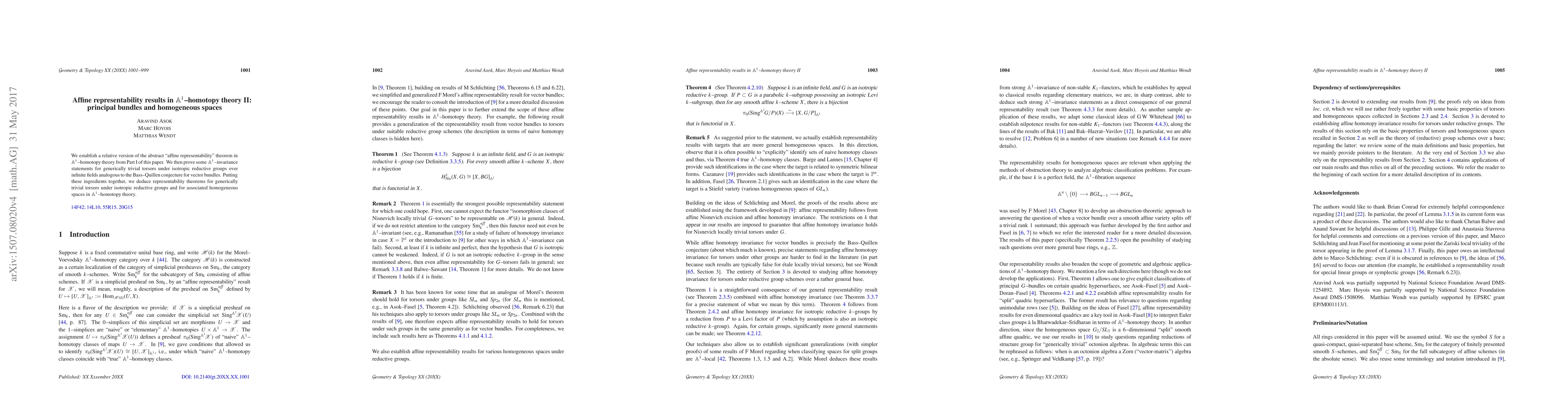 This paper extends the affine representability theorem in ${\mathbb A}^1$-homotopy theory to include principal bundles and homogeneous spaces. It proves ${\mathbb A}^1$-invariance for generically trivial torsors under isotropic reductive groups and deduces representability theorems for these structures.