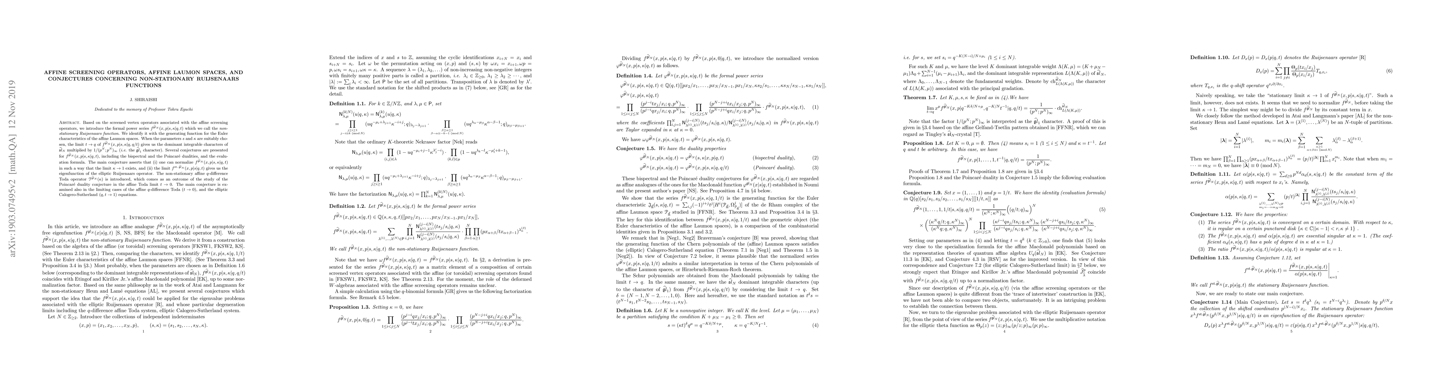 Based on the screened vertex operators associated with the affine screening operators, we introduce the formal power series f^{hat{gl}_N}(x,p|s,kappa|q,t) which we call the non-stationary Ruijsenaars function. We identify it with the generating function for the Euler characteristics of the affine Laumon spaces. When the parameters s and kappa are suitably chosen, the limit t rightarrow q of f^{hat{gl}_N}(x,p|s,kappa|q,q/t) gives us the dominant integrable characters of hat{sl}_N multiplied by 1/(p^N;p^N)_infty (i.e. the hat{gl}_1 character). Several conjectures are presented for f^{hat{gl}_N}(x,p|s,kappa|q,t), including the bispectral and the Poincare dualities, and the evaluation formula. Main Conjecture asserts that (i) one can normalize f^{hat{gl}_N}(x,p|s,kappa|q,t) in such a way that the limit kappa rightarrow 1 exists, and (ii) the limit f^{st.hat{gl}_N}(x,p|s|q,t) gives us the eigenfunction of the elliptic Ruijsenaars operator. The non-stationary affine q-difference Toda operator T^{hat{gl}_N}(kappa) is introduced, which comes as an outcome of the study of the Poincare duality conjecture in the affine Toda limit t rightarrow 0. Main Conjecture is examined also in the limiting cases of the affine q-difference Toda (t rightarrow 0), and the elliptic Calogero-Sutherland (q,t rightarrow 1) equations.