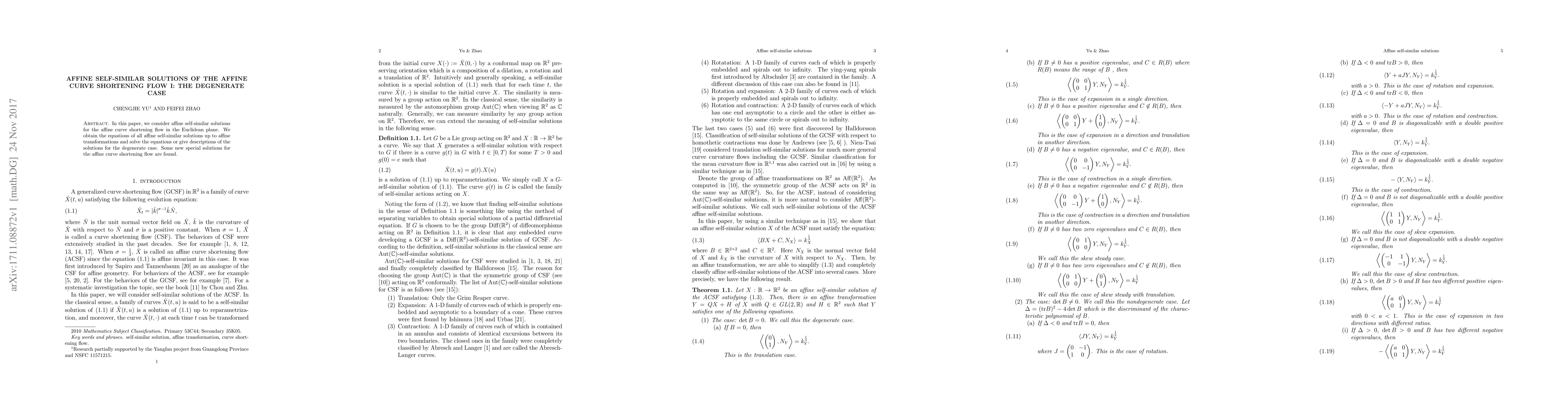 This paper explores affine self-similar solutions for the affine curve shortening flow in the Euclidean plane, deriving equations for all such solutions and providing detailed descriptions for the degenerate case, including new special solutions.