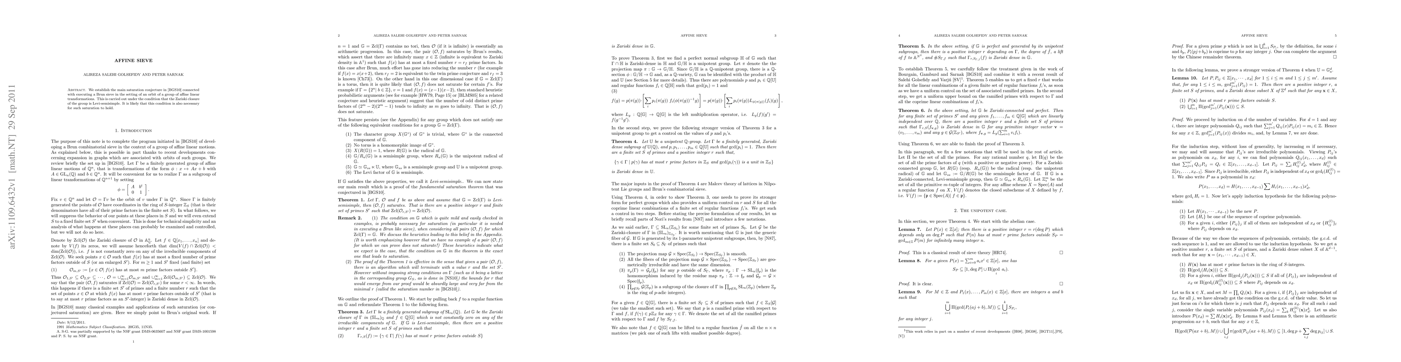 Summary: The paper proves the main saturation conjecture in the context of an affine sieve using a Brun sieve on an orbit of affine linear transformations, under the condition that the Zariski closure of the group is Levi-semisimple. This condition is likely necessary for the conjecture's validity.