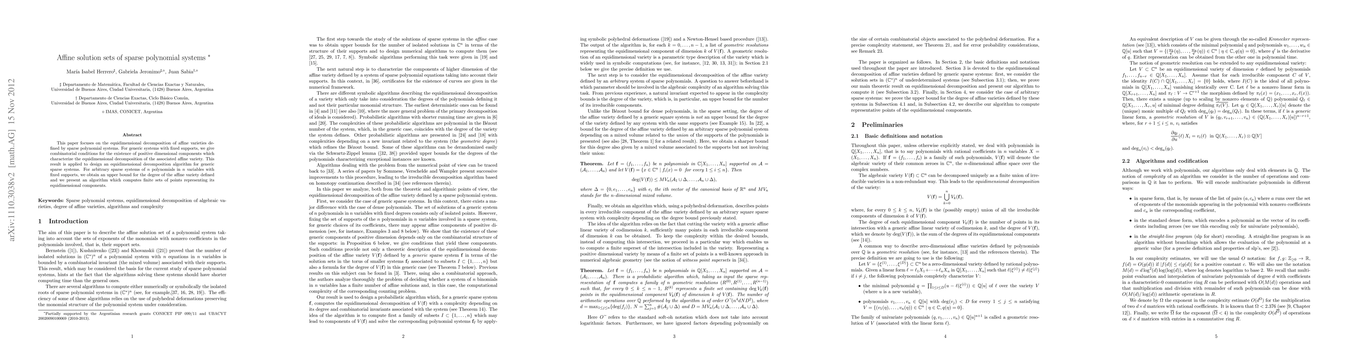 This paper provides combinatorial conditions for the equidimensional decomposition of affine varieties defined by sparse polynomial systems, and designs an algorithm to compute their equidimensional components. It also establishes an upper bound for the degree of the variety and presents an algorithm for arbitrary sparse systems.