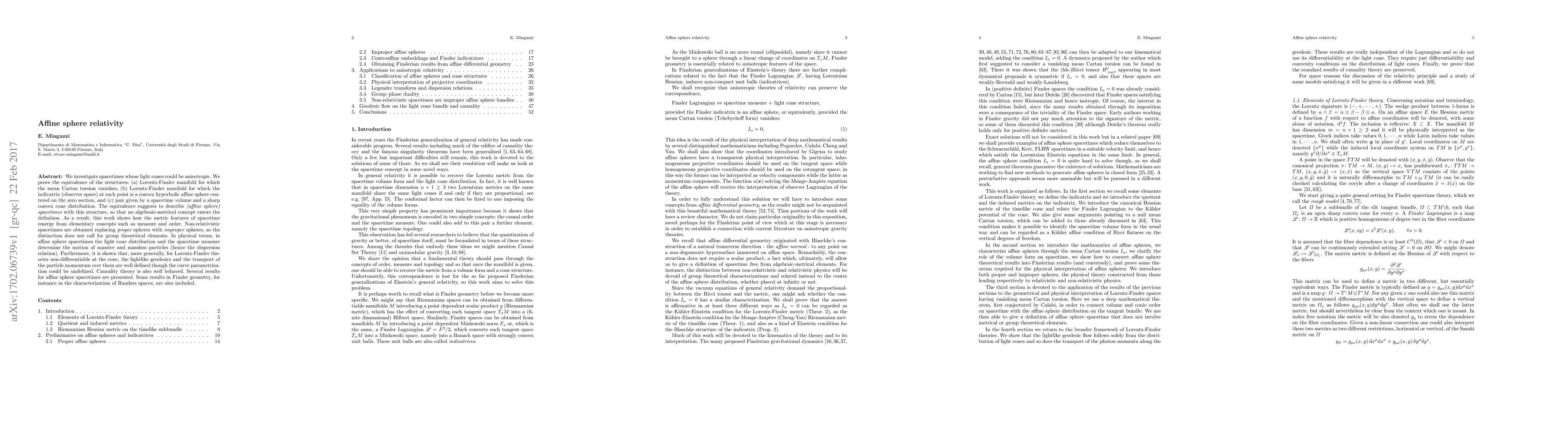 We investigate spacetimes whose light cones could be anisotropic. We prove the equivalence of the structures: (a) Lorentz-Finsler manifold for which the mean Cartan torsion vanishes, (b) Lorentz-Finsler manifold for which the indicatrix (observer space) at each point is a convex hyperbolic affine sphere centered on the zero section, and (c) pair given by a spacetime volume and a sharp convex cone distribution. The equivalence suggests to describe {\em (affine sphere) spacetimes} with this structure, so that no algebraic-metrical concept enters the definition. As a result, this work shows how the metric features of spacetime emerge from elementary concepts such as measure and order. Non-relativistic spacetimes are obtained replacing proper spheres with improper spheres, so the distinction does not call for group theoretical elements. In physical terms, in affine sphere spacetimes the light cone distribution and the spacetime measure determine the motion of massive and massless particles (hence the dispersion relation). Furthermore, it is shown that, more generally, for Lorentz-Finsler theories non-differentiable at the cone, the lightlike geodesics and the transport of the particle momentum over them are well defined though the curve parametrization could be undefined. Causality theory is also well behaved. Several results for affine sphere spacetimes are presented. Some results in Finsler geometry, for instance in the characterization of Randers spaces, are also included.