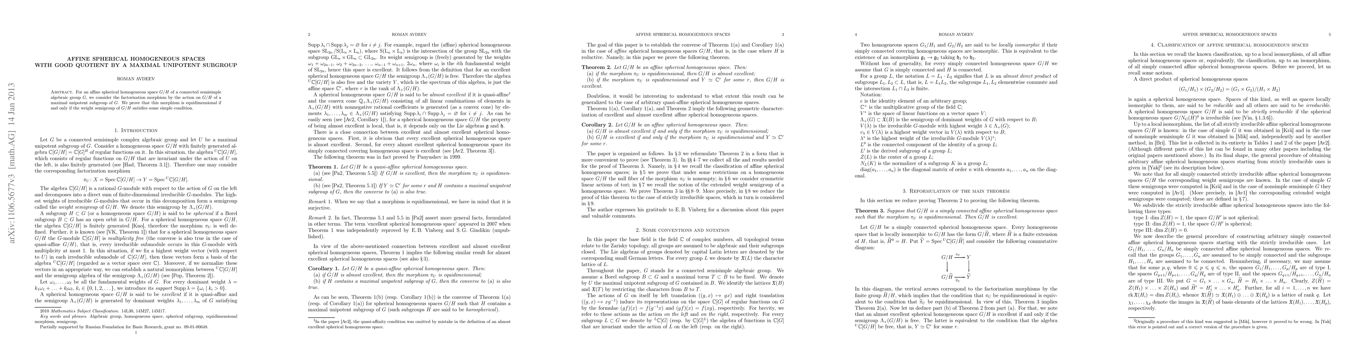 Summary: The paper proves that for an affine spherical homogeneous space G/H, the factorization morphism by the action of a maximal unipotent subgroup is equidimensional if and only if the weight semigroup of G/H meets a specific criterion. This establishes a condition for the existence of a good quotient.