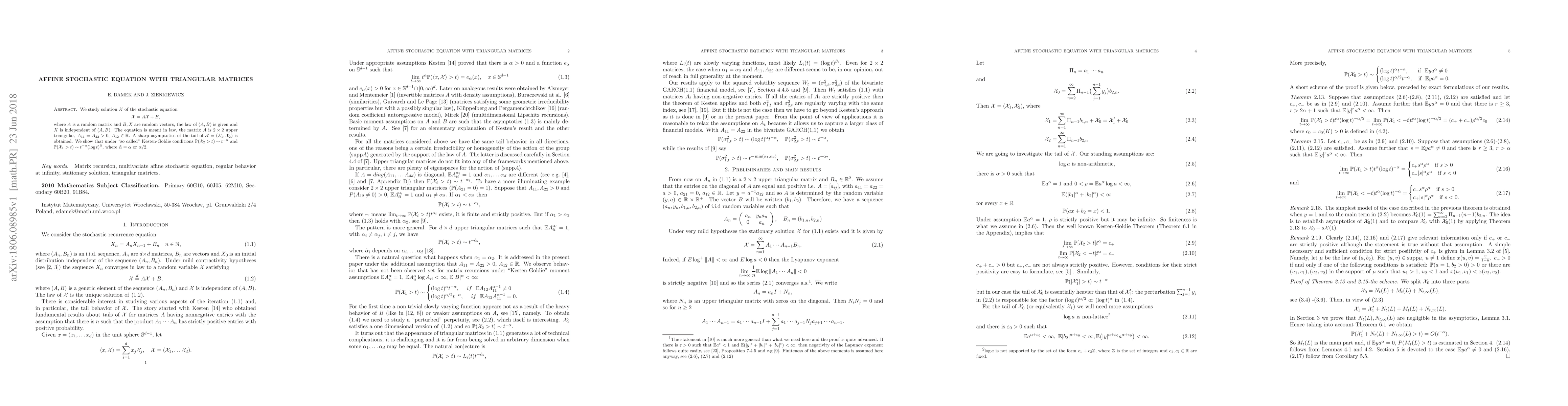 A research paper studies the solution X of a stochastic equation with a 2x2 upper triangular matrix A, finding asymptotics for the tail probabilities of X's components under certain conditions.