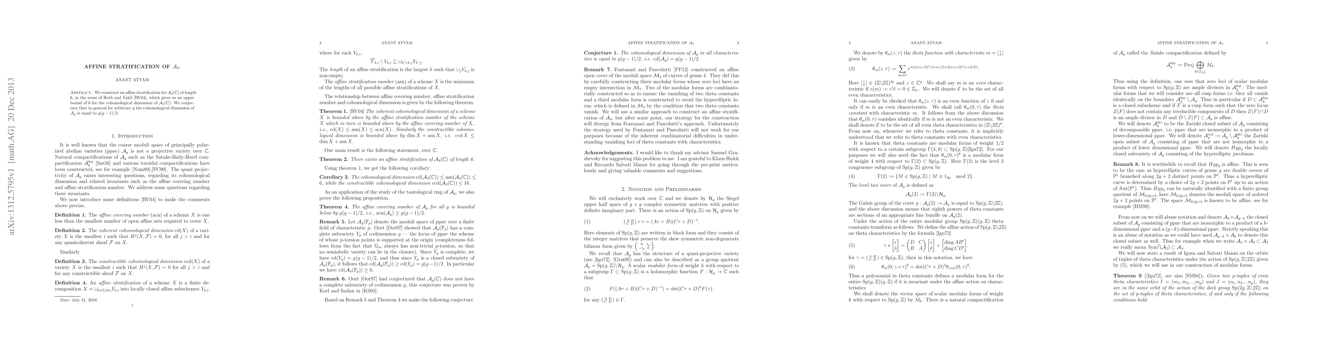 We construct an affine stratification for $\mathcal A_4(\mathbb C)$ of length 6, in the sense of Roth and Vakil, which gives us an upper bound of 6 for the cohomological dimension of $\mathcal A_4(\mathbb C)$. We conjecture that in general for arbitrary $g$ the cohomological dimension of $\mathcal A_g$ is equal to $g(g-1)/2$.