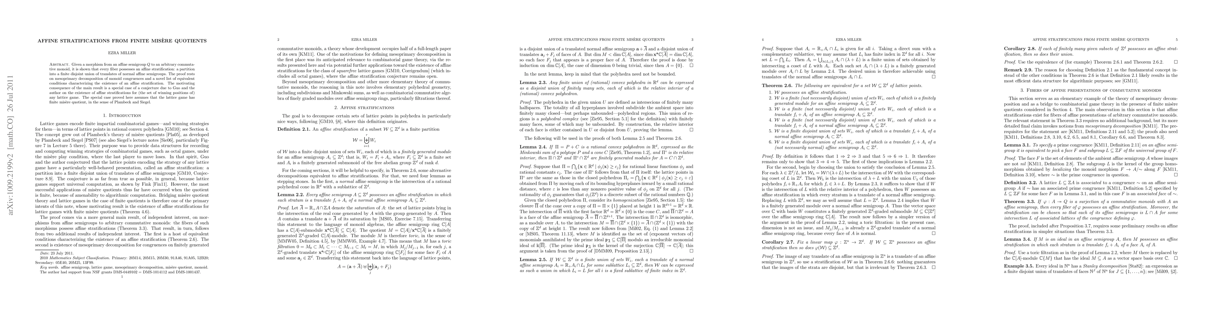 Given a morphism from an affine semigroup Q to an arbitrary commutative monoid, it is shown that every fiber possesses an affine stratification: a partition into a finite disjoint union of translates of normal affine semigroups. The proof rests on mesoprimary decomposition of monoid congruences [arXiv:1107.4699] and a novel list of equivalent conditions characterizing the existence of an affine stratification. The motivating consequence of the main result is a special case of a conjecture due to Guo and the author [arXiv:0908.3473, arXiv:1105.5420] on the existence of affine stratifications for (the set of winning positions of) any lattice game. The special case proved here assumes that the lattice game has finite mis\'ere quotient, in the sense of Plambeck and Siegel [arXiv:math/0501315, arXiv:math/0609825v5].