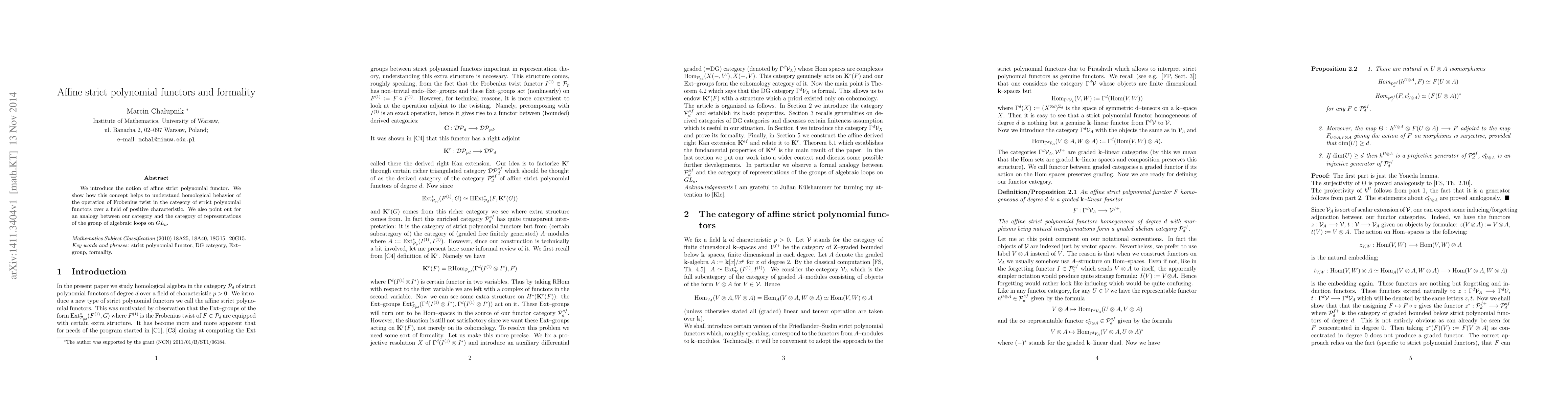 We introduce the notion of affine strict polynomial functor. We show how this concept helps to understand homological behavior of the operation of Frobenius twist in the category of strict polynomial functors over a field of positive characteristic. We also point out for an analogy between our category and the category of representations of the group of algebraic loops on $GL_n$.