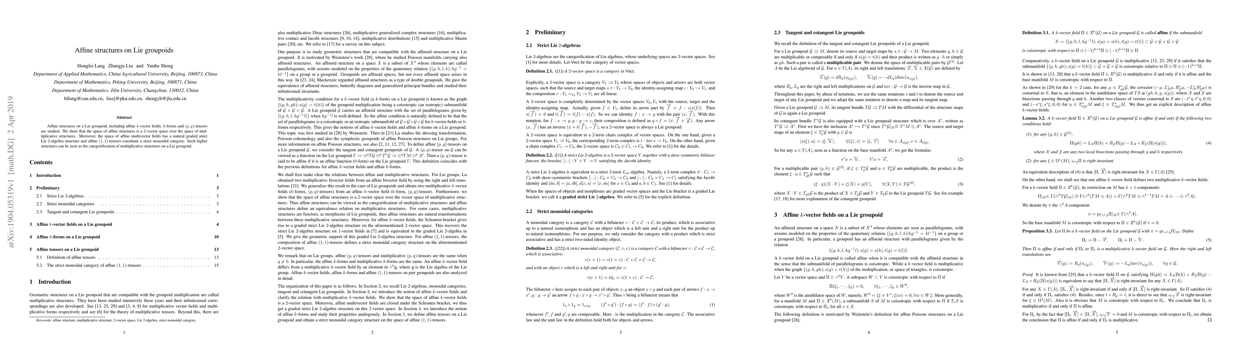 Affine structures on a Lie groupoid, including affine $k$-vector fields, $k$-forms and $(p,q)$-tensors are studied. We show that the space of affine structures is a 2-vector space over the space of multiplicative structures. Moreover, the space of affine multivector fields has a natural graded strict Lie 2-algebra structure and affine (1,1)-tensors constitute a strict monoidal category. Such higher structures can be seen as the categorification of multiplicative structures on a Lie groupoid.