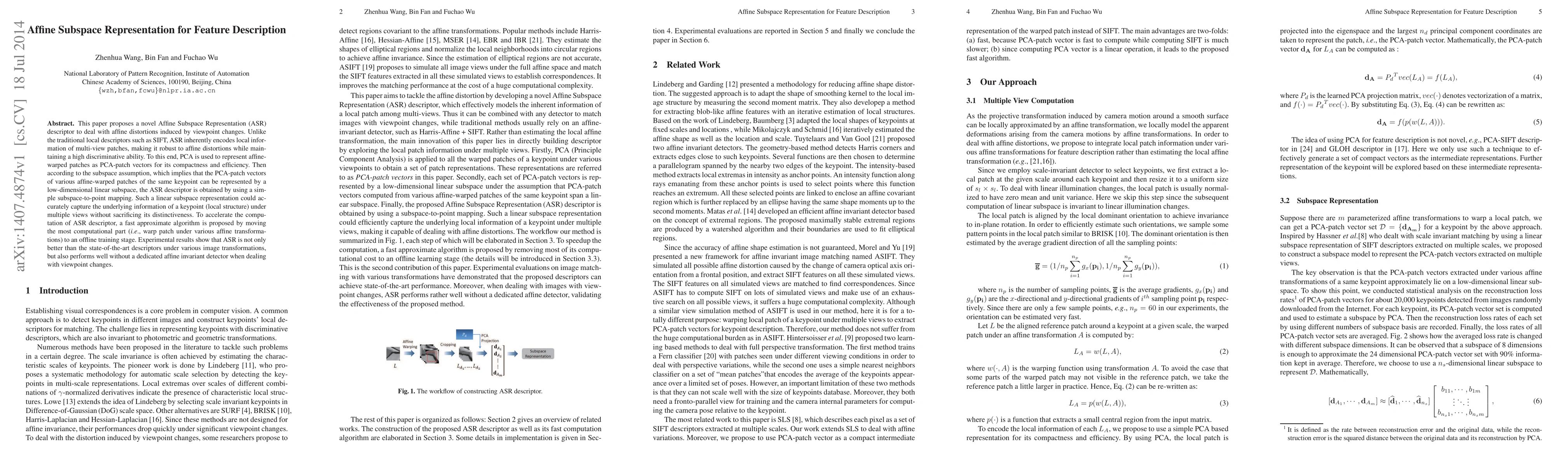 This paper introduces an Affine Subspace Representation (ASR) descriptor that robustly handles affine distortions from viewpoint changes by encoding local information of multi-view patches. The ASR descriptor is efficient and discriminative, utilizing PCA for compact representation and a fast approximate algorithm to accelerate computation.