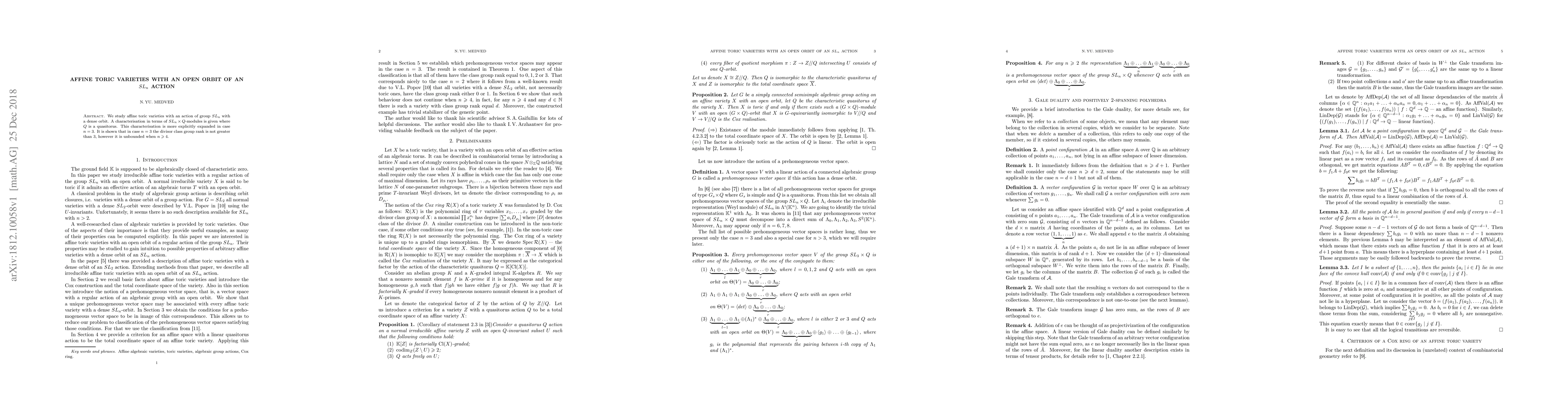 This paper characterizes affine toric varieties with a dense $SL_n$ orbit through $SL_n \times Q$-modules, where $Q$ is a quasitorus, and provides a detailed analysis for $n=3$ showing that the class group rank is at most 3, but it is unbounded for $n \geq 4$.