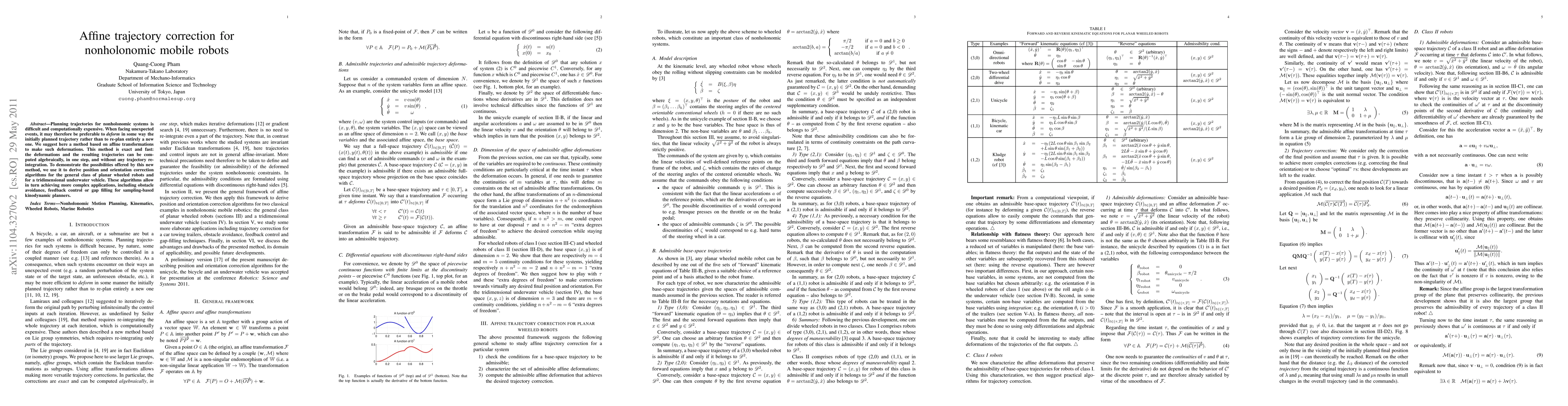 This paper proposes an affine transformation-based method for correcting nonholonomic mobile robot trajectories efficiently, enabling quick deformations without full re-planning. The method is demonstrated for planar wheeled robots and underwater vehicles, facilitating applications like obstacle avoidance and feedback control.