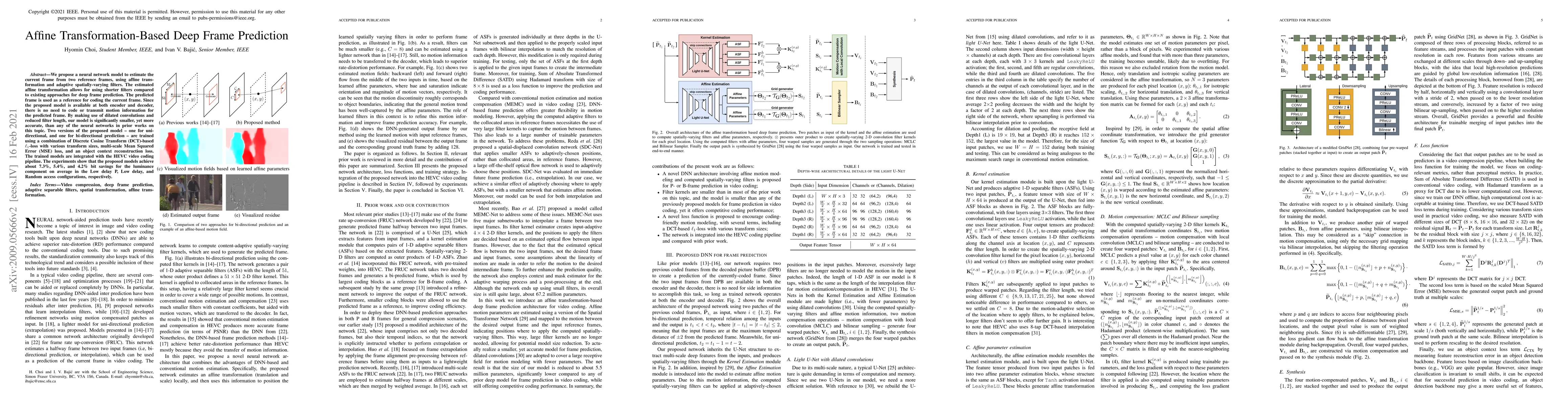 We propose a neural network model to estimate the current frame from two reference frames, using affine transformation and adaptive spatially-varying filters. The estimated affine transformation allows for using shorter filters compared to existing approaches for deep frame prediction. The predicted frame is used as a reference for coding the current frame. Since the proposed model is available at both encoder and decoder, there is no need to code or transmit motion information for the predicted frame. By making use of dilated convolutions and reduced filter length, our model is significantly smaller, yet more accurate, than any of the neural networks in prior works on this topic. Two versions of the proposed model - one for uni-directional, and one for bi-directional prediction - are trained using a combination of Discrete Cosine Transform (DCT)-based l1-loss with various transform sizes, multi-scale Mean Squared Error (MSE) loss, and an object context reconstruction loss. The trained models are integrated with the HEVC video coding pipeline. The experiments show that the proposed models achieve about 7.3%, 5.4%, and 4.2% bit savings for the luminance component on average in the Low delay P, Low delay, and Random access configurations, respectively.