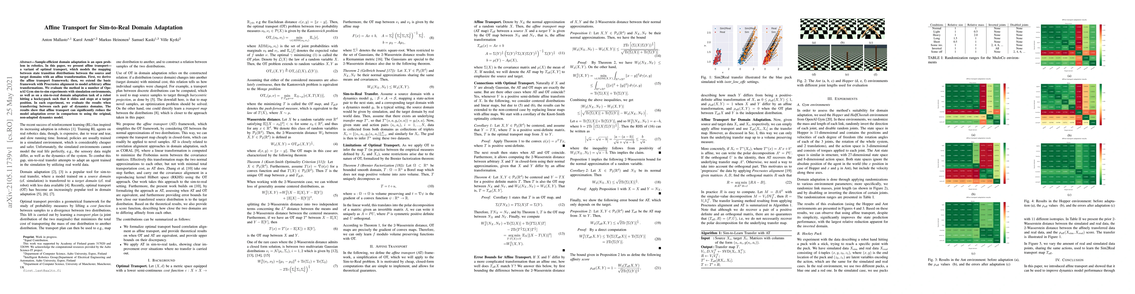 Sample-efficient domain adaptation is an open problem in robotics. In this paper, we present affine transport -- a variant of optimal transport, which models the mapping between state transition distributions between the source and target domains with an affine transformation. First, we derive the affine transport framework; then, we extend the basic framework with Procrustes alignment to model arbitrary affine transformations. We evaluate the method in a number of OpenAI Gym sim-to-sim experiments with simulation environments, as well as on a sim-to-real domain adaptation task of a robot hitting a hockeypuck such that it slides and stops at a target position. In each experiment, we evaluate the results when transferring between each pair of dynamics domains. The results show that affine transport can significantly reduce the model adaptation error in comparison to using the original, non-adapted dynamics model.