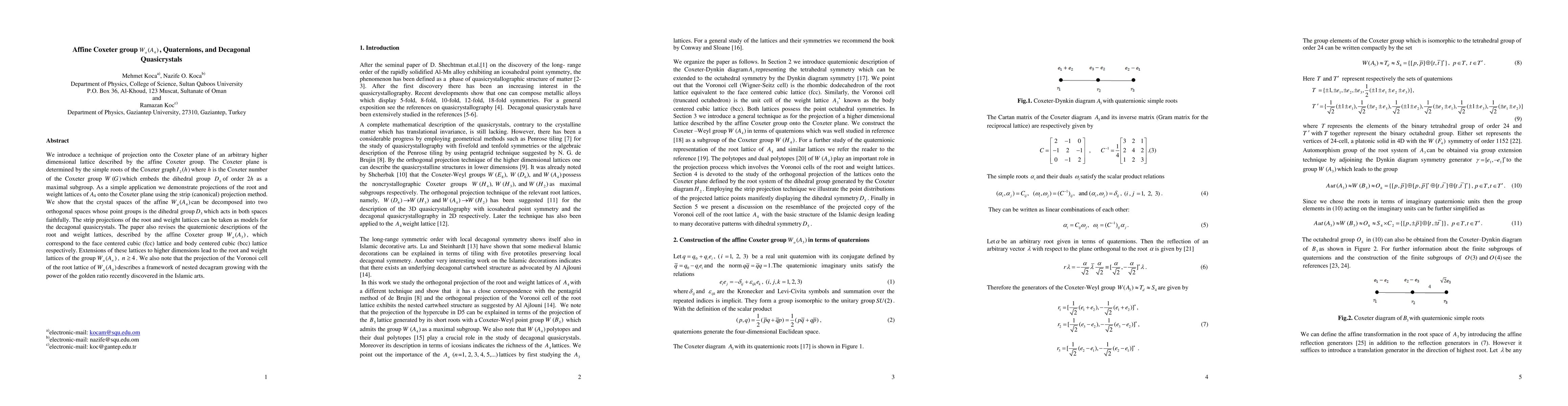 We introduce a technique of projection onto the Coxeter plane of an arbitrary higher dimensional lattice described by the affine Coxeter group. The Coxeter plane is determined by the simple roots of the Coxeter graph I2 (h) where h is the Coxeter number of the Coxeter group W(G) which embeds the dihedral group Dh of order 2h as a maximal subgroup. As a simple application we demonstrate projections of the root and weight lattices of A4 onto the Coxeter plane using the strip (canonical) projection method. We show that the crystal spaces of the affine Wa(A4) can be decomposed into two orthogonal spaces whose point groups is the dihedral group D5 which acts in both spaces faithfully. The strip projections of the root and weight lattices can be taken as models for the decagonal quasicrystals. The paper also revises the quaternionic descriptions of the root and weight lattices, described by the affine Coxeter group Wa(A3), which correspond to the face centered cubic (fcc) lattice and body centered cubic (bcc) lattice respectively. Extensions of these lattices to higher dimensions lead to the root and weight lattices of the group Wa(An), n>=4 . We also note that the projection of the Voronoi cell of the root lattice of Wa(A4) describes a framework of nested decagram growing with the power of the golden ratio recently discovered in the Islamic arts.