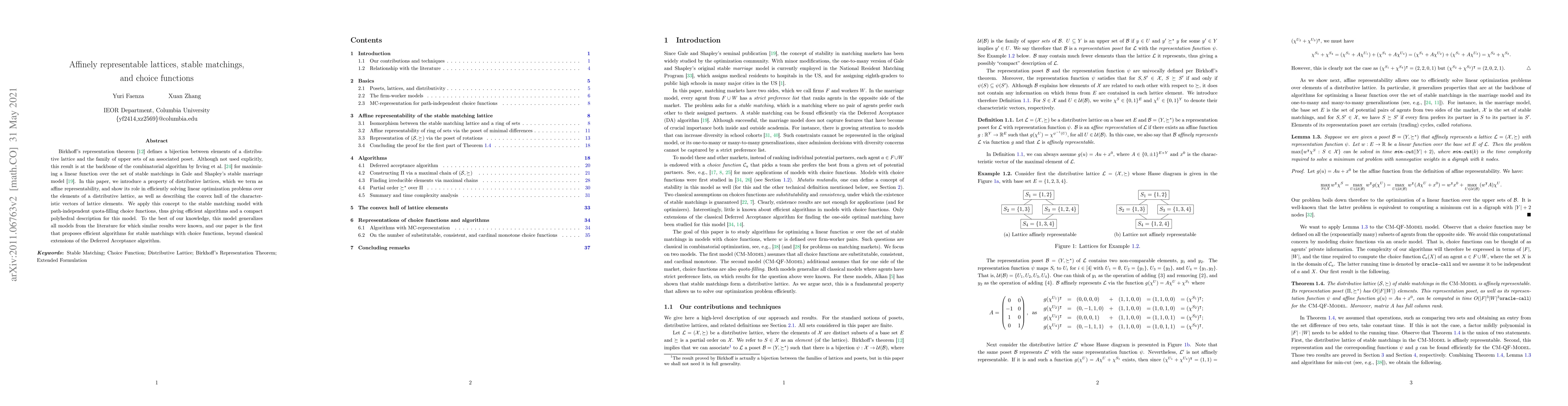 Birkhoff's representation theorem (Birkhoff, 1937) defines a bijection between elements of a distributive lattice and the family of upper sets of an associated poset. Although not used explicitly, this result is at the backbone of the combinatorial algorithm by Irving et al. (1987) for maximizing a linear function over the set of stable matchings in Gale and Shapley's stable marriage model (Gale and Shapley, 1962). In this paper, we introduce a property of distributive lattices, which we term as affine representability, and show its role in efficiently solving linear optimization problems over the elements of a distributive lattice, as well as describing the convex hull of the characteristic vectors of the lattice elements. We apply this concept to the stable matching model with path-independent quota-filling choice functions, thus giving efficient algorithms and a compact polyhedral description for this model. To the best of our knowledge, this model generalizes all models from the literature for which similar results were known, and our paper is the first that proposes efficient algorithms for stable matchings with choice functions, beyond classical extensions of the Deferred Acceptance algorithm.