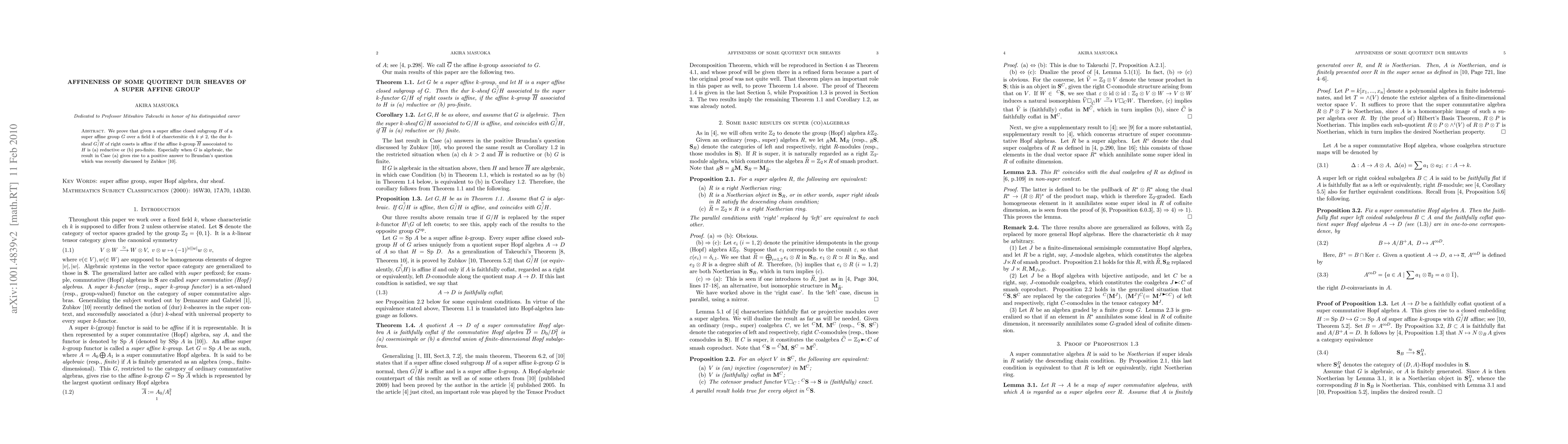 We prove that given a super affine closed subgroup $H$ of a super affine group $G$ over a field $k$ of charctersitic $\mathrm{ch} k \ne 2$, the dur $k$-sheaf $G\tilde{\tilde{/}} H$ of right cosets is affine if the affine $k$-group $\bar{H}$ assocoiated to $H$ is (a) reductive or (b) pro-finite. Especially when $G$ is algebraic, the result in Case (a) gives rise to a positive answer to Brundan's question which was recently discussed by Zubkov \cite{Z}.