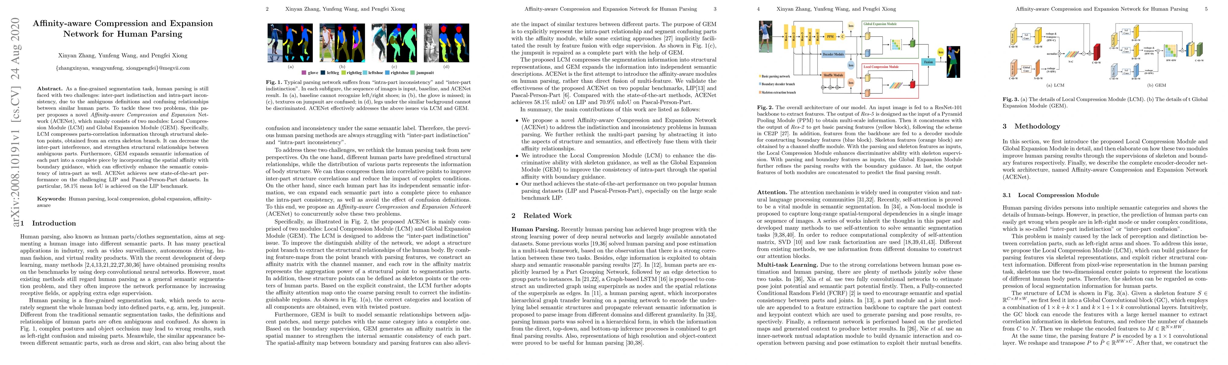 A new network architecture called ACENet is proposed to improve human parsing accuracy by addressing inter-part indistinction and intra-part inconsistency. It achieves state-of-the-art performance on two challenging datasets with a mean IoU of 58.1%.