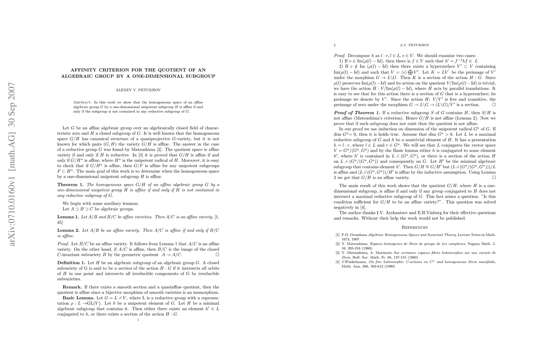 Summary: The paper establishes that the quotient of an affine algebraic group $G$ by a one-dimensional unipotent subgroup $H$ is affine if and only if $H$ does not lie within any reductive subgroup of $G$. This result provides a criterion for the affineness of the homogeneous space.