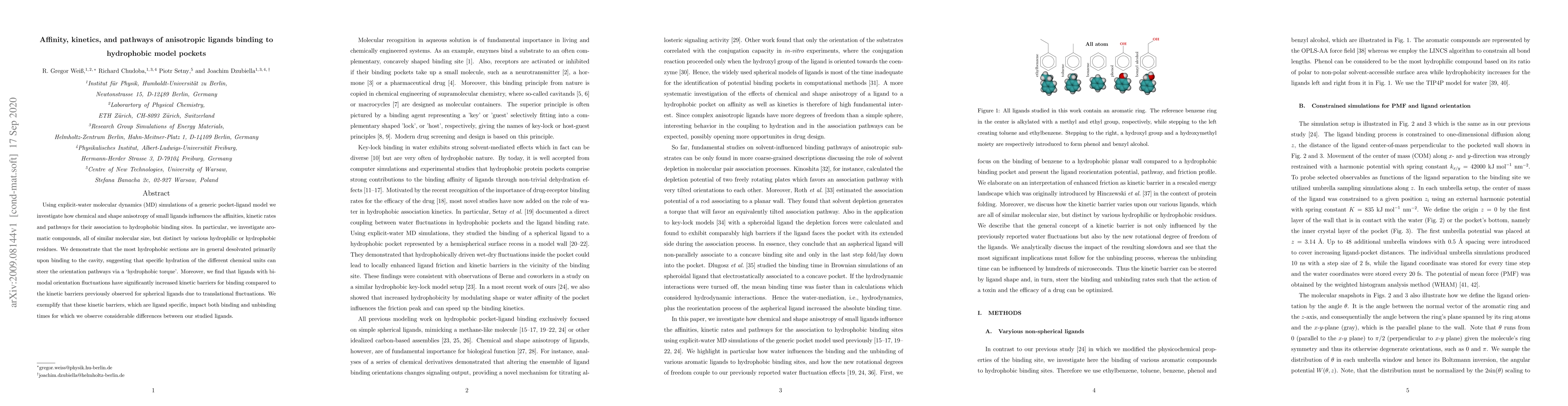 Using explicit-water molecular dynamics (MD) simulations of a generic pocket-ligand model we investigate how chemical and shape anisotropy of small ligands influences the affinities, kinetic rates and pathways for their association to hydrophobic binding sites. In particular, we investigate aromatic compounds, all of similar molecular size, but distinct by various hydrophilic or hydrophobic residues. We demonstrate that the most hydrophobic sections are in general desolvated primarily upon binding to the cavity, suggesting that specific hydration of the different chemical units can steer the orientation pathways via a `hydrophobic torque'. Moreover, we find that ligands with bimodal orientation fluctuations have significantly increased kinetic barriers for binding compared to the kinetic barriers previously observed for spherical ligands due to translational fluctuations. We exemplify that these kinetic barriers, which are ligand specific, impact both binding and unbinding times for which we observe considerable differences between our studied ligands.
