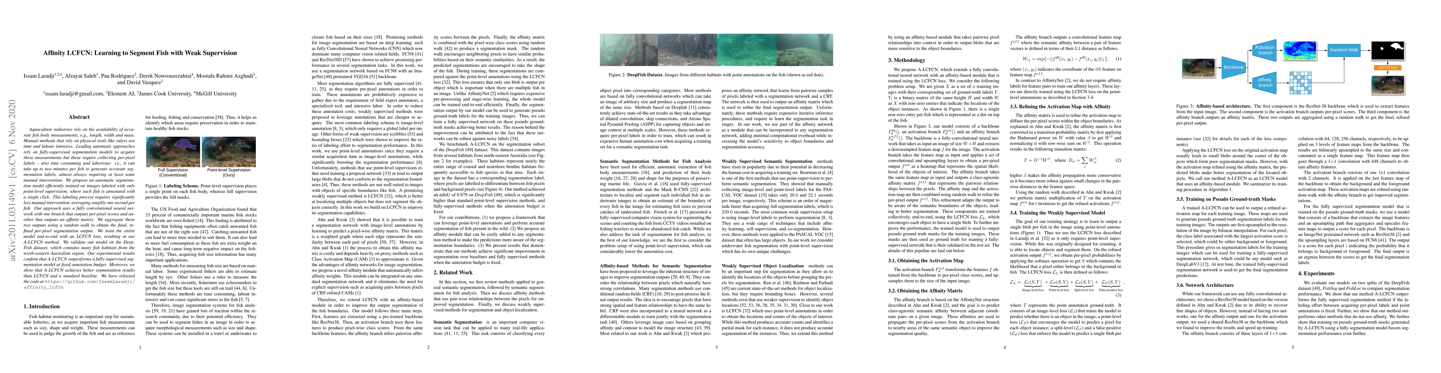 Aquaculture industries rely on the availability of accurate fish body measurements, e.g., length, width and mass. Manual methods that rely on physical tools like rulers are time and labour intensive. Leading automatic approaches rely on fully-supervised segmentation models to acquire these measurements but these require collecting per-pixel labels -- also time consuming and laborious: i.e., it can take up to two minutes per fish to generate accurate segmentation labels, almost always requiring at least some manual intervention. We propose an automatic segmentation model efficiently trained on images labeled with only point-level supervision, where each fish is annotated with a single click. This labeling process requires significantly less manual intervention, averaging roughly one second per fish. Our approach uses a fully convolutional neural network with one branch that outputs per-pixel scores and another that outputs an affinity matrix. We aggregate these two outputs using a random walk to obtain the final, refined per-pixel segmentation output. We train the entire model end-to-end with an LCFCN loss, resulting in our A-LCFCN method. We validate our model on the DeepFish dataset, which contains many fish habitats from the north-eastern Australian region. Our experimental results confirm that A-LCFCN outperforms a fully-supervised segmentation model at fixed annotation budget. Moreover, we show that A-LCFCN achieves better segmentation results than LCFCN and a standard baseline. We have released the code at \url{https://github.com/IssamLaradji/affinity_lcfcn}.