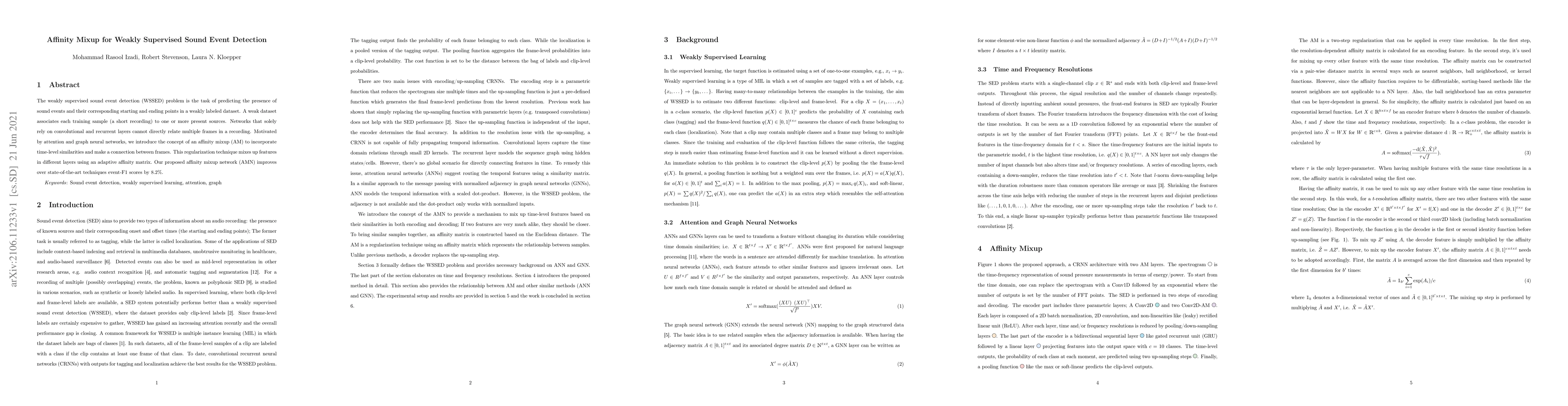 The weakly supervised sound event detection problem is the task of predicting the presence of sound events and their corresponding starting and ending points in a weakly labeled dataset. A weak dataset associates each training sample (a short recording) to one or more present sources. Networks that solely rely on convolutional and recurrent layers cannot directly relate multiple frames in a recording. Motivated by attention and graph neural networks, we introduce the concept of an affinity mixup to incorporate time-level similarities and make a connection between frames. This regularization technique mixes up features in different layers using an adaptive affinity matrix. Our proposed affinity mixup network improves over state-of-the-art techniques event-F1 scores by $8.2\%$.