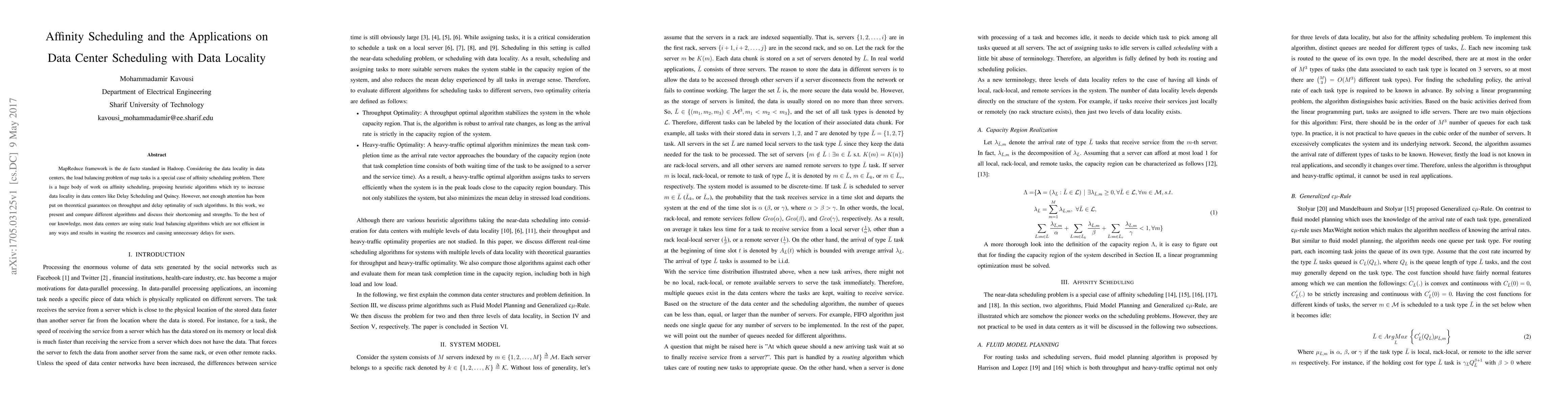 This paper examines affinity scheduling algorithms for optimizing data locality in data centers, particularly within the MapReduce framework. It compares existing heuristics like Delay Scheduling and Quincy, highlighting their shortcomings and strengths, and argues that static load balancing algorithms are inefficient and resource-wasting.