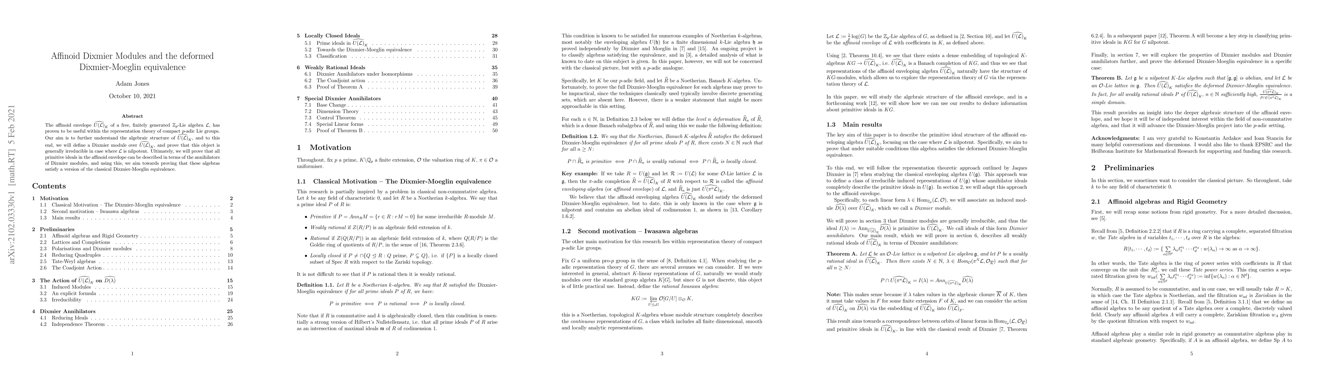 The affinoid envelope, $\widehat{U(\mathcal{L})}$ of a free, finitely generated $\mathbb{Z}_p$-Lie algebra $\mathcal{L}$ has proven to be useful within the representation theory of compact $p$-adic Lie groups. Our aim is to further understand the algebraic structure of $\widehat{U(\mathcal{L})}$, and to this end, we will define a Dixmier module over $\widehat{U(\mathcal{L})}$, and prove that this object is generally irreducible in case where $\mathcal{L}$ is nilpotent. Ultimately, we will prove that all primitive ideals in the affinoid envelope can be described in terms of the annihilators of Dixmier modules, and using this, we aim towards proving that these algebras satisfy a version of the classical Dixmier-Moeglin equivalence.