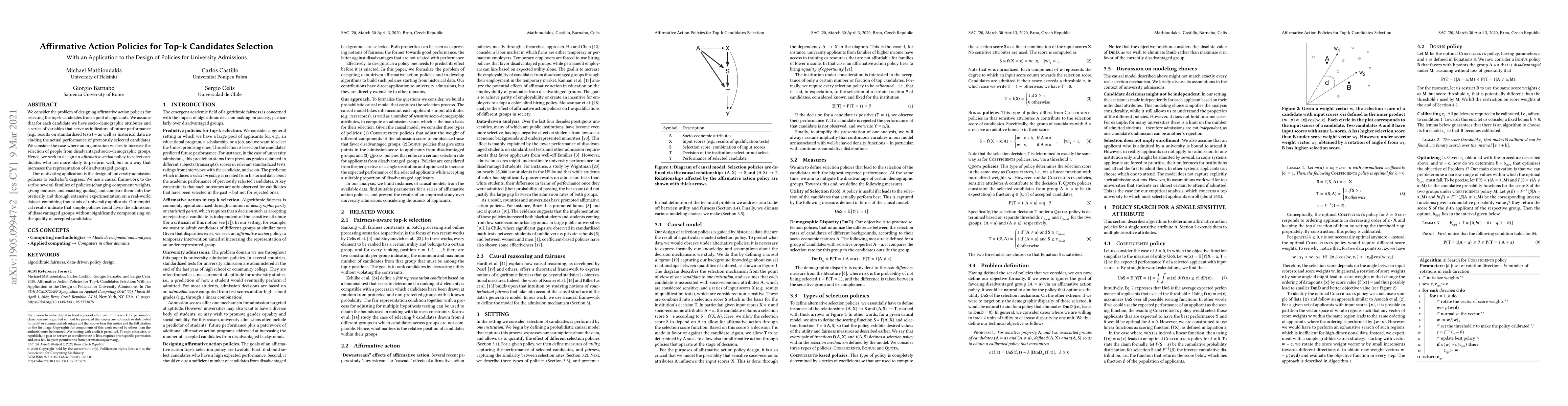 This paper explores the design of affirmative action policies for selecting top-k candidates, focusing on university admissions. It proposes various policy frameworks balancing performance likelihood with socio-demographic representation, and demonstrates their effectiveness through theoretical analysis and empirical testing on a large dataset.