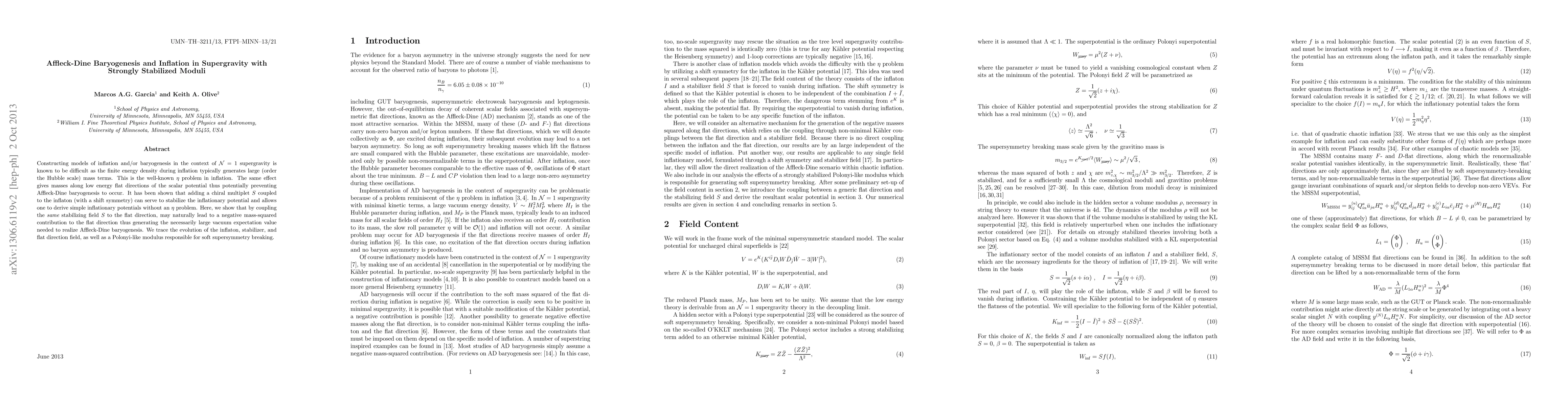 This paper explores models of inflation and Affleck-Dine baryogenesis in N=1 supergravity, addressing the eta problem by coupling a stabilizing chiral multiplet S to the inflaton and flat direction fields. It demonstrates how this coupling can generate the necessary vacuum expectation value for Affleck-Dine baryogenesis while maintaining a stable inflationary potential.