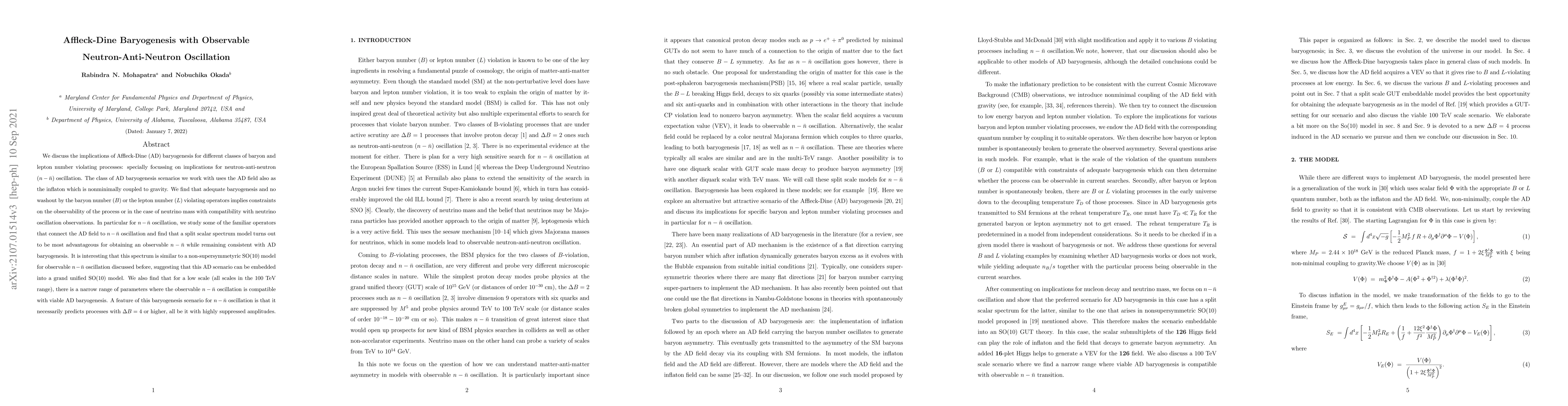 This paper explores Affleck-Dine baryogenesis linked to observable neutron-anti-neutron oscillation, finding that a split scalar spectrum model is optimal for observing $n-\bar{n}$ oscillation while maintaining consistency with AD baryogenesis, and noting a compatible parameter range in the 100 TeV scale.